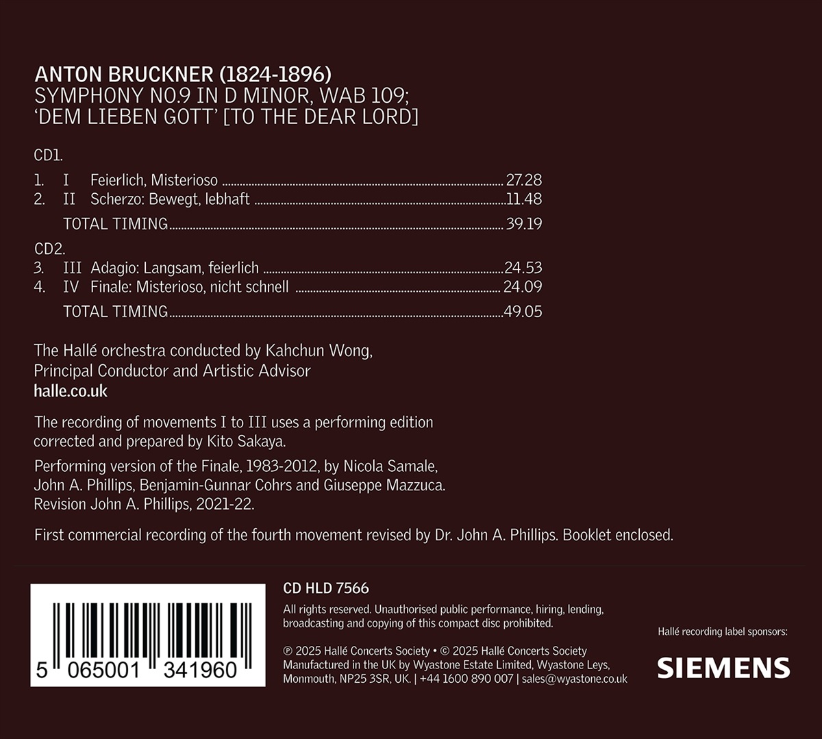 Bruckners Neunte Sinfonie wurde 1887 begonnen und traditionell in den drei Sätzen aufgeführt, die er bis November 1894 fertiggestellt hatte. Er begann in den letzten 18 Monaten seines Lebens mit der detaillierten Komposition eines Schlusssatzes, und 1983 begannen die Musikwissenschaftler Nicola Samale, John Phillips, Benjamin-Gunnar Cohrs und Guiseppe Mazzuca mit der Rekonstruktion des „Finales“, die wiederum kürzlich von Dr. John A. Phillips überarbeitet wurde. Diese Veröffentlichung enthält die erste kommerzielle Aufnahme dieser Fassung, aufgenommen 2024 in der Bridgewater Hall in Manchester. Die Sinfonie sollte Bruckners letztes und größtes Werk werden, ein musikalisches Testament, das sein gesamtes Schaffen krönt. Als tief religiöser Mensch offenbart Bruckner mit der Widmung des Werks „dem lieben Gott“ seine Absicht, sich mit dem auseinanderzusetzen, was Phillips als „die ultimativen Fragen des Glaubens, des Todes und des Schicksals der Seele“ bezeichnet. Die daraus resultierende Musik durchläuft eine ganze Bandbreite von Emotionen: geheimnisvoll und feierlich, transzendent, verzückt und manchmal erschreckend. Die Orchestrierung ist reichhaltig, einschließlich einer erweiterten Hornsektion mit vier Wagnertuben. Diese Aufnahme wird sich für diejenigen als unverzichtbar erweisen, die das Werk in der vorgesehenen viersätzigen Form hören möchten. Enthalten ist ein Booklet mit einer persönlichen Einführung von Kahchun Wong, der das Hallé dirigiert und einem Text von Dr. John A. Phillips, der das vorliegende Material von Bruckner beschreibt und die Rekonstruktion erläutert.