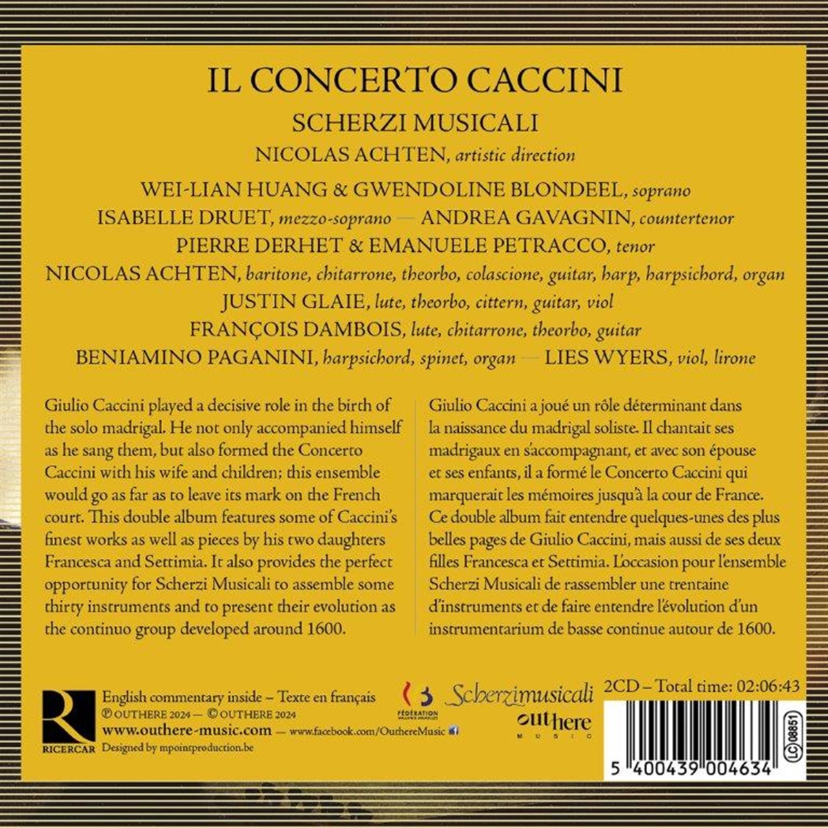 Giulio Caccini spielte eine entscheidende Rolle bei der Entstehung des Solomadrigals. Er begleitete sich nicht nur selbst beim Singen, sondern gründete mit seiner Frau und seinen Kindern das Concerto Caccini, ein Ensemble, das sogar am französischen Hof Spuren hinterlassen sollte. Dieses Doppelalbum enthält einige der schönsten Werke Caccinis sowie Stücke seiner beiden Töchter Francesca und Settimia. Außerdem bietet es dem Ensemble Scherzi Musicali die perfekte Gelegenheit, etwa dreißig Instrumente zusammenzustellen und die Kombinationen von Instrumenten zu präsentieren, die um 1600 für die Continuo-Gruppe verwendet wurden.