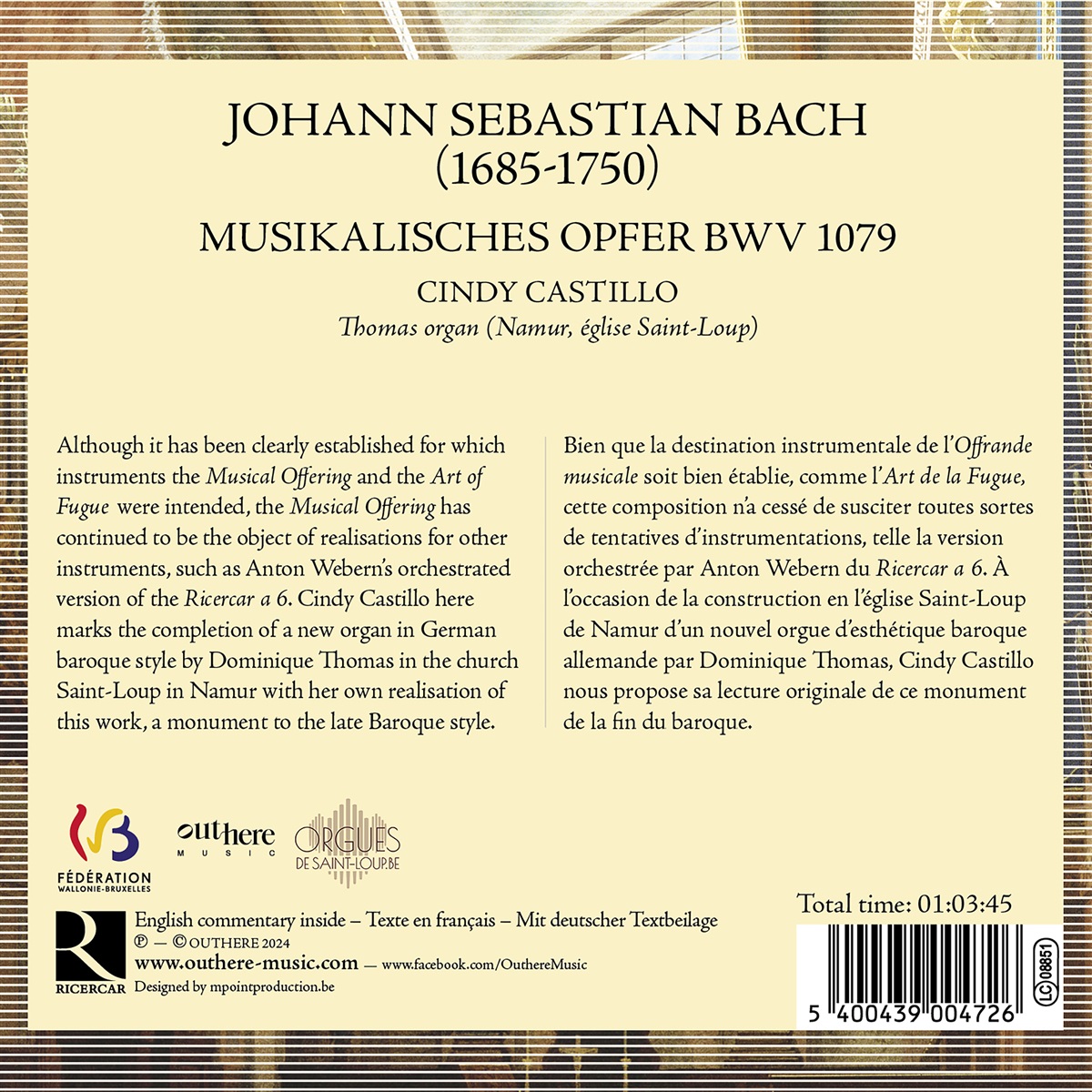Da es immer noch Unklarheiten gibt, für welche Instrumente Teile des „Musikalische Opfers“ und vor allem die „Kunst der Fuge“ bestimmt waren, wurde Bachs Werke immer wieder für andere Instrumente umgesetzt, wie z. B. in Anton Weberns orchestrierter Version des Ricercar à 6. Cindy Castillo feiert die Fertigstellung einer neuen Orgel im Stil des deutschen Barocks von Dominique Thomas in der Kirche Saint-Loup in Namur mit ihrer eigenen Umsetzung des Musikalischen Opfers, das ein Denkmal des Spätbarocks darstellt.