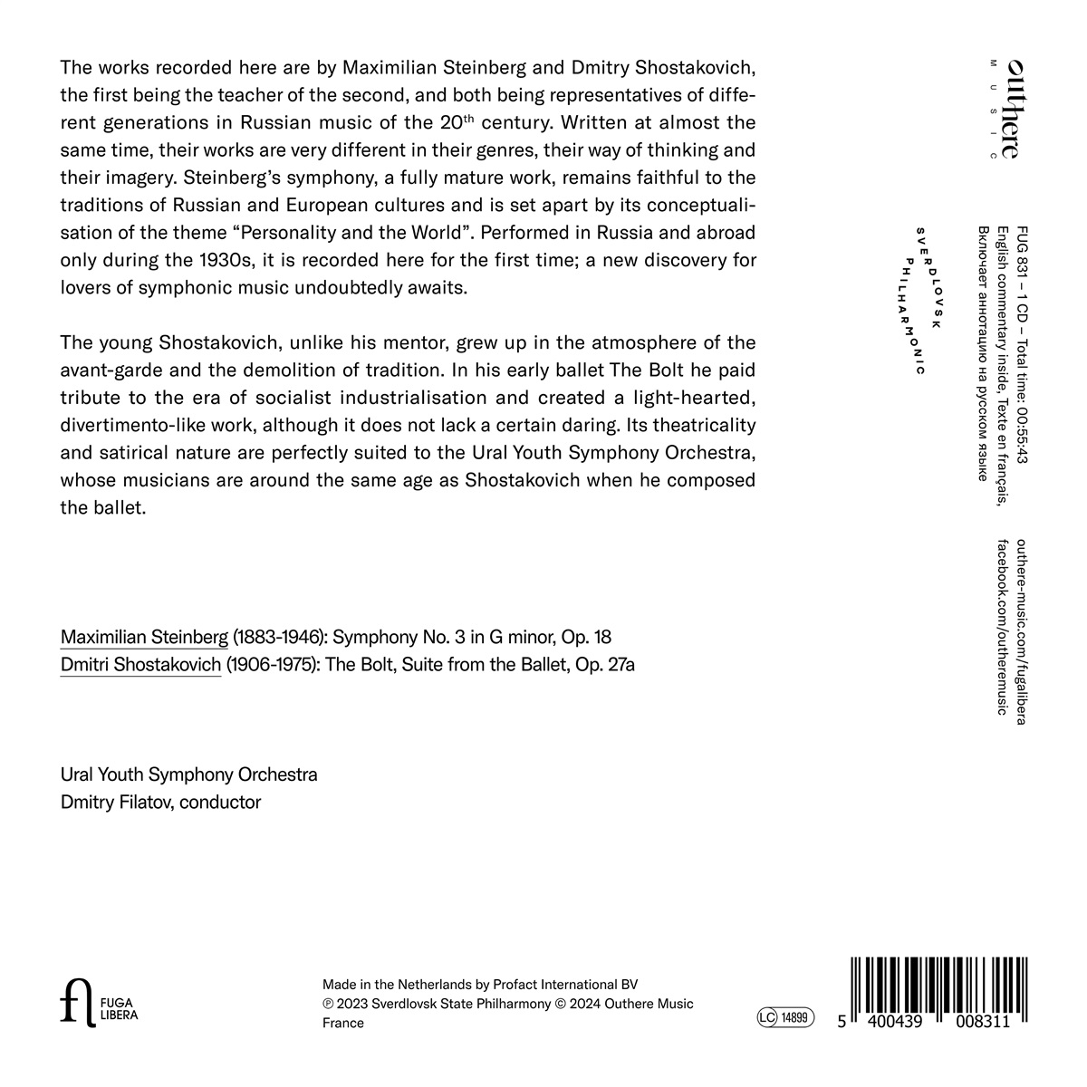 Die hier aufgenommenen Werke stammen von Maximilian Steinberg und Dmitri Schostakowitsch. Der erste ist der Lehrer des zweiten, beide sind Vertreter verschiedener Generationen der russischen Musik des 20. Jahrhunderts. Fast zur gleichen Zeit geschrieben, unterscheiden sich ihre Werke in Gattung, Denkweise und Klangsprache. Steinbergs Sinfonie, ein voll ausgereiftes Werk, bleibt den Traditionen der russischen und europäischen Kultur treu und hebt sich durch seine Konzeption des Themas ‚Die Persönlichkeit und die Welt‘ ab. Sie wurde erst in den 1930er Jahren in Russland und im Ausland aufgeführt und erscheint auf diesem Album als Weltersteinspielung: eine neue Entdeckung für Liebhaber sinfonischer Musik. Der junge Schostakowitsch wuchs im Gegensatz zu seinem Mentor in der Atmosphäre der Avantgarde und des Abbruchs der Tradition auf. In seinem frühen Ballett „Der Bolzen“ zollte er der Ära der sozialistischen Industrialisierung Tribut und schuf ein unbeschwertes, divertimento-artiges Werk, dem es jedoch nicht an einer gewissen Kühnheit fehlt. Seine Theatralik und sein satirischer Charakter eignen sich perfekt für das Ural Youth Symphony Orchestra, dessen Musiker etwa so alt sind wie Schostakowitsch, als er das Ballett komponierte.