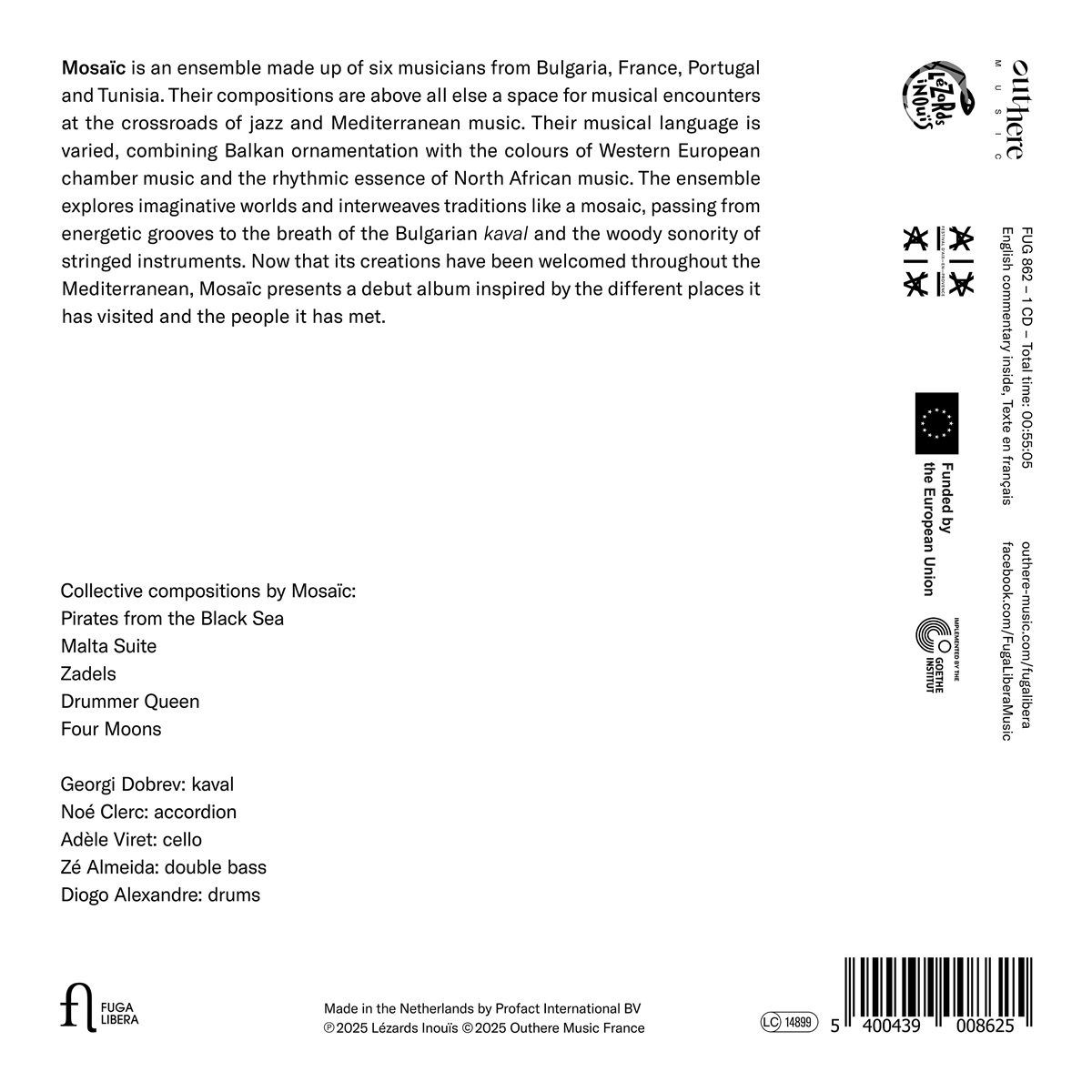 Die Mitglieder des sechsköpfigen Ensembles Mosaïc stammen aus Bulgarien, Frankreich, Portugal und Tunesien. Ihre Kompositionen bieten Raum für musikalische Begegnungen an der Schnittstelle zwischen Jazz und mediterraner Musik. Ihre Tonsprache ist reich und vielschichtig: balkantypische Verzierungen treffen auf die Farben westlicher Kammermusik, nordafrikanische Rhythmen verschmelzen mit europäischer Melodik. Das Ensemble taucht in fantasievolle Klangwelten ein: Traditionen fügen sich zum farbenprächtigen und namensgebenden Mosaik, in dem treibende Grooves auf den weiten Atem der bulgarischen Kaval und den warmen Holzklang der Streicher treffen. Nachdem ihre Musik bereits überall am Mittelmeer mit offenen Armen empfangen wurde, legt Mosaïc nun ein Debütalbum vor, das von all den bereisten Orten und den Menschen erzählt, denen das Ensemble dort begegnet ist.
