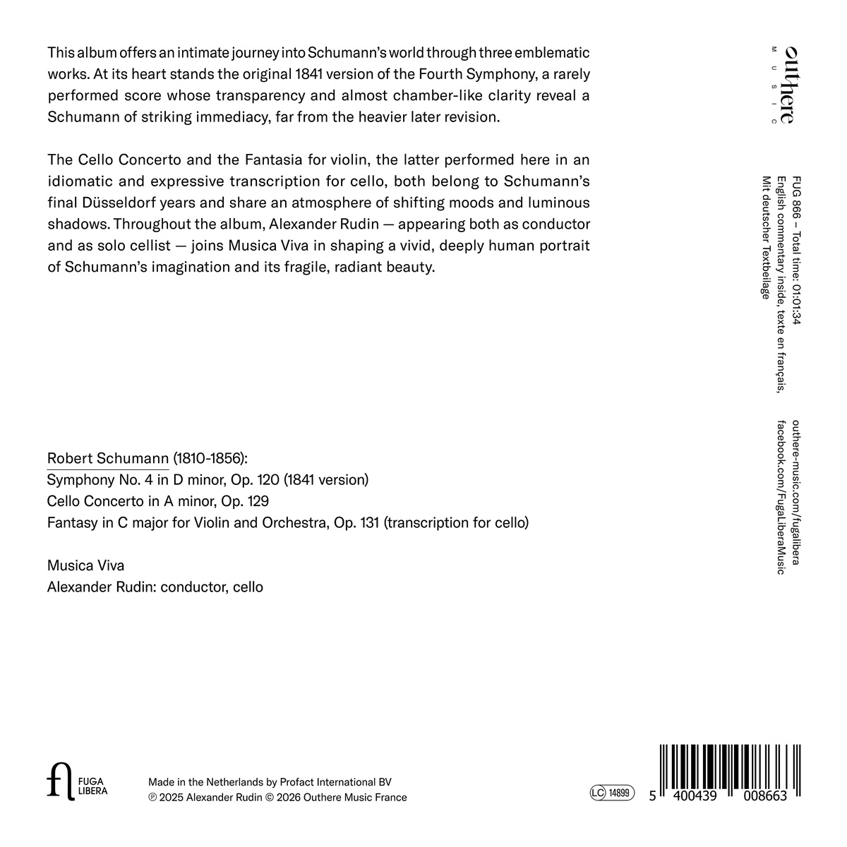 Dieses Album gewährt anhand von drei symbolträchtigen Werken einen intimen Einblick in Schumanns Welt. Im Mittelpunkt steht die Originalfassung der Vierten Symphonie von 1841, eine selten aufgeführte Partitur, deren Transparenz und fast kammermusikalische Klarheit weit entfernt sind von der Schwere der späteren Überarbeitung und einen Schumann von beeindruckender Unmittelbarkeit offenbaren. Das Cellokonzert und die Fantasie für Violine, letztere hier in einer idiomatischen und ausdrucksstarken Transkription für Cello, stammen beide aus Schumanns letzten Düsseldorfer Jahren und teilen eine Atmosphäre wechselnder Stimmungen und leuchtender Schatten. Auf dem gesamten Album gestaltet Alexander Rudin – sowohl als Dirigent als auch als Solocellist – gemeinsam mit Musica Viva ein lebendiges, zutiefst menschliches Bild von Schumanns Vorstellungswelt und ihrer zerbrechlichen, strahlenden Schönheit.