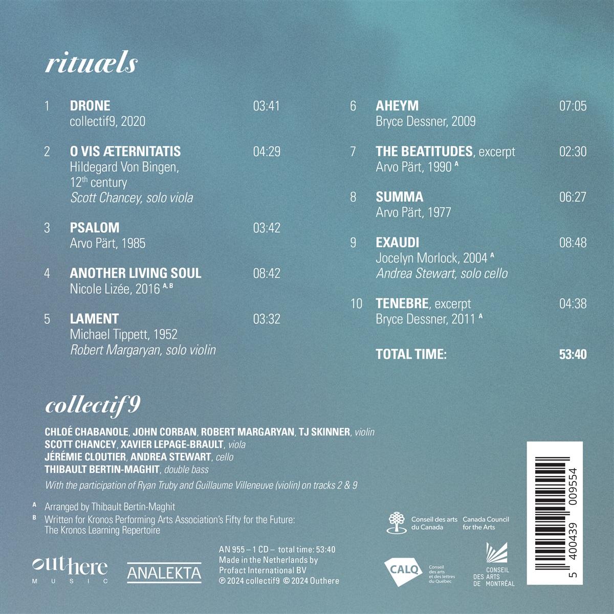 Das in Montréal ansässige Streicherensemble Collectif9 präsentiert ein weiteres innovatives Programm mit Werken von Hildegard von Bingen, Arvo Pärt, Michael Tippett, Nicole Lizée, Bryce Dessner und Jocelyn Morlock. „Rituæls“ ist eine neue Sammlung mit Musik vom Mittelalter bis zur Moderne mit einer Erzählung – einer künstlerischen Geste – die an die menschliche Tradition der Weitergabe von Wissen und Praktiken in Kultur und Kunst erinnert. Ein Element der Kontinuität verbindet jedes Musikstück mit dem nächsten, sei es in Form eines Borduns oder einer gehaltenen Note, eines sich unmerklich wandelnden Akkords oder einer Gruppe sich ständig wiederholender Töne. Die ersten Aufführungen beinhalteten Tanz und Bewegung, eine Idee, die die Interpretation und die Entwicklung des Programms, das auf diesem Album zu hören ist, beeinflusst hat.