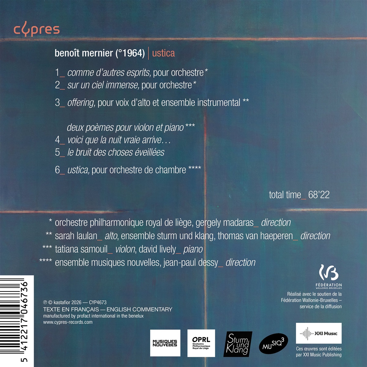 Das Album „Ustica“ markiert eine weitere Etappe in der fest etablierten Beziehung zwischen Benoît Mernier und dem Plattenlabel Cypres, das seit 25 Jahren die Entwicklung der musikalischen Sprache des Komponisten und die Entfaltung seiner künstlerischen Identität begleitet. Es erscheint zeitgleich mit der Uraufführung seiner neuen Oper „Bartelby“ an der Opéra Royal de Wallonie. „Ustica“ offenbart einen Moment der Reife, in dem sich formale Strenge, Poesie und Erinnerung miteinander verbinden.