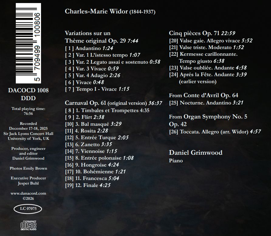 Charles-Marie Widor komponierte Bühnenmusik, den Vokalmusik, Orchesterwerke, das Kammerstücke und – dafür ist er am bekanntesten – Orgelmusik. Wenn die primäre Ausdrucksform eines Komponisten der König der Instrumente ist, kann seinem Ruf eine gewisse Strenge anhaften, und das ist wohl bei der populären Sicht auf Widor der Fall, denn kaum ein Komponist ist gleichzeitig so berühmt und so unbekannt. Die Klavierwerke zeigen Aspekte von Widors Kunst, die in seinem bahnbrechenden Zyklus von zehn Orgelsinfonien weniger präsent sind und die das Gewicht seines beträchtlichen Intellekts und seiner Gelehrsamkeit tragen; beim Schreiben für Klavier scheint Widor in der Lage zu sein, andere, phantasievollere Aspekte seines Wesens zu erkunden. Unser Verständnis für diesen großen Komponisten wird dadurch bereichert. Der Pianist Daniel Grimwood hat versucht, Werke auszuwählen, die die große Vielfalt der Stile in Widors Soloklaviermusik repräsentieren. Daniel Grimwood ist für das virtuose Klavierrepertoire des 19. Jahrhunderts bekannt. Grimwoods Aufnahmen und Aufführungen der Musik von Adolph von Henselt wurden von der Presse gelobt. Seine Einspielung von Henselts sämtlichen Etüden wurde vom Gramophone Magazine als ‚Instant Classic’ bezeichnet und zur Klavierveröffentlichung des Jahres 2023 gekürt.