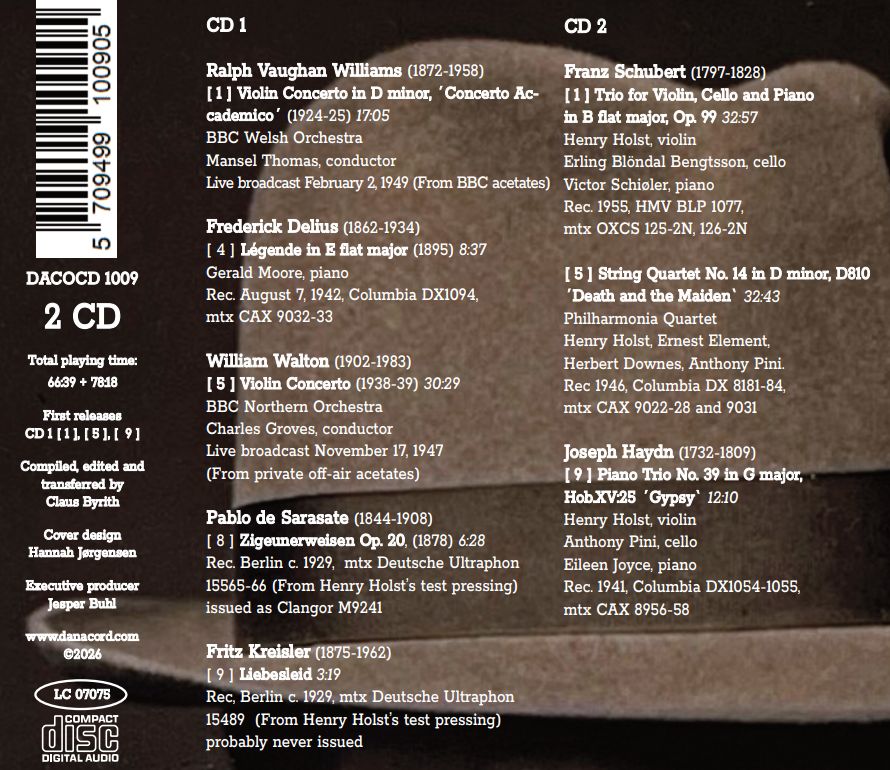 Henry Holst studierte am Königlichen Musikkonservatorium in Kopenhagen Violine bei Axel Gade sowie Klavier und Harmonielehre bei Carl Nielsen. Schon in dem Jahr, als er sein Studium abschloss, trat er zum ersten Mal öffentlich als Solist auf. Anschließend setzte er seine Ausbildung in Kopenhagen bei Emil Telmányi und in Berlin bei Willy Hess fort. Wieder zurück in Dänemark er hielt er eine Stelle als Geiger im Königlichen Dänischen Orchester. Doch schon wenig später, 1923, stellte er sich als Kandidat für die Leitung der Berliner Philharmoniker vor, die nach dem Tod von Artur Nikisch im Jahr zuvor nun Wilhelm Furtwängler als Chefdirigenten hatten. Er setzte sich gegen 14 Mitbewerber durch und freute sich, mit dem großen Dirigenten zusammenarbeiten zu können. Das vorliegende Doppelalbum ist die erste Veröffentlich der raren Live-Aufnahmen der Violinkonzerte von Ralph Vaughan Williams und William Walton, dazu kommen Stücke von Frederick Delius, Paplo der Sarasate, Fritz Kreisler, Franz Schubert und Joseph Haydn.
