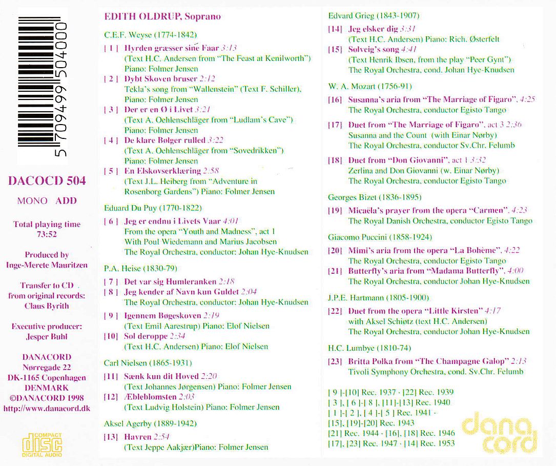 Felumb, Svend Christian / Hye-Knudsen, Johan / Jacobsen, Marius / Jensen, Folmer / Nielsen, Elof / Oldrup, Edith / Royal Danish Orchestra / The Royal Orchestra / Schiøtz, Aksel / Tango, Egisto / Tivoli Symphony Orchestra / Wiedemann, Poul