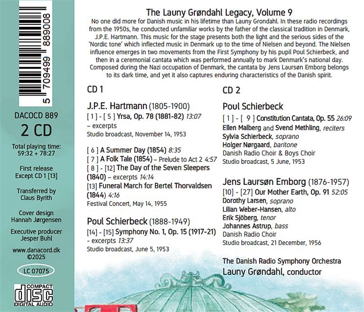 Kaum jemand hat in seinem Leben mehr für die dänische Musik getan als Launy Grøndahl. In diesen Radioaufnahmen aus den 1950er Jahren dirigierte er unbekannte Werke des Vaters der dänischen Klassik, Johann Peter Emilius Hartmann. Diese Bühnenmusik zeigt sowohl die heitere als auch die ernste Seite des ‚nordischen Klangs’ , der die Musik in Dänemark bis zu Nielsen und darüber hinaus prägte. Der Einfluss Nielsens zeigt sich in zwei Sätzen aus der ersten Sinfonie seines Schülers Poul Schierbeck und in einer feierlichen Kantate, die jährlich zum dänischen Nationalfeiertag aufgeführt wurde. Die Kantate von Jens Laursøn Emborg entstand während der nationalsozialistischen Besetzung Dänemarks und gehört damit zu dieser dunklen Zeit, doch sie fängt auch die beständigen Eigenschaften des dänischen Geistes ein.