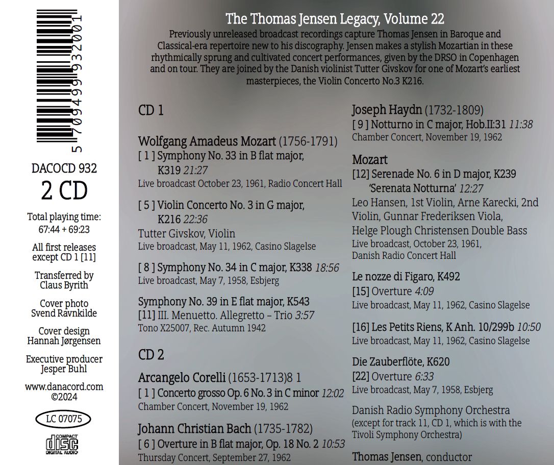 | Home / NEUHEITEN The Thomas Jensen Legacy Vol. 22 (Sym. No. 33 / Violin Concerto No. 3 / Sym. No. 34 / Sym. No. 39 / Conc. Grosso Op. 6 No. 3 / Ouverture in B flat / Notturno Hob II:31 / Serenata NotturnaFigaro Overture / Petits Riens / Zauberflöe Overure) |