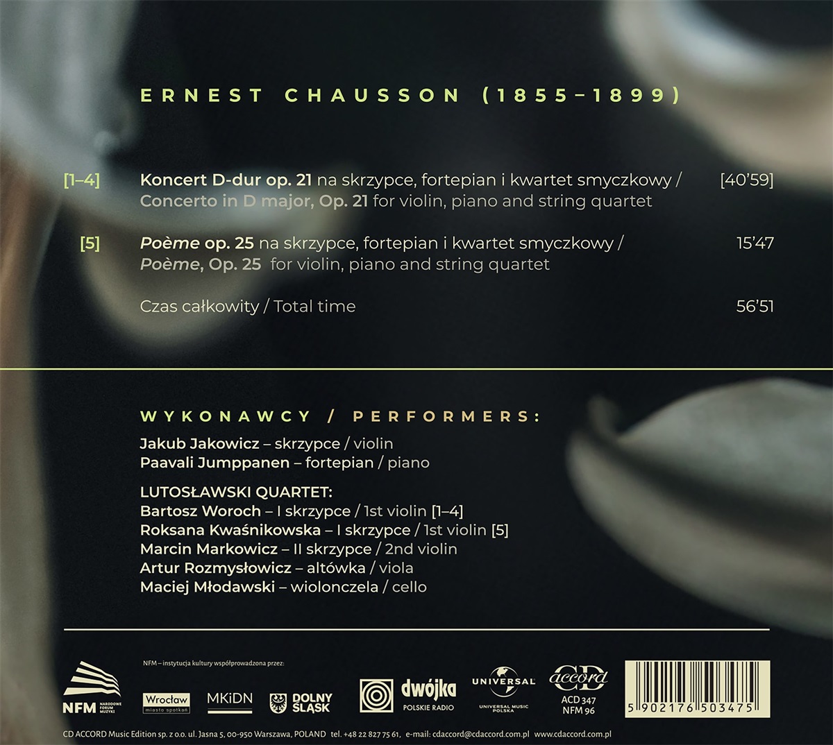 Als Ernest Chausson geboren wurde, war er noch in der Berlioz-Ära, sein zukünftiger Lehrer César Franck war 33 Jahre alt, Jules Massenet, ebenfalls sein späterer Professor, war 13 Jahre alt, und Gabriel Fauré, der später „die größte musikalische Autorität in Frankreich zu dieser Zeit“ werden sollte, war erst 10 Jahre alt. Claude Debussy war noch nicht geboren. Interessanterweise endete Chaussons irdischer Weg durch eine fatale Wendung des Schicksals - ein Fahrradunfall während eines Urlaubs - fast am Ende des 19. Jahrhunderts, obwohl sein Spätwerk bereits den zukünftigen Horizont der Musik andeutete. Nota bene: 1894 brach in Frankreich mit der Uraufführung von Debussys Prélude à l'Après-midi d'un faune der so genannte musikalische Impressionismus aus. Dennoch kann man sich des Gedankens kaum erwehren, dass Ernest Chausson eine besondere Stellung in der Galaxie