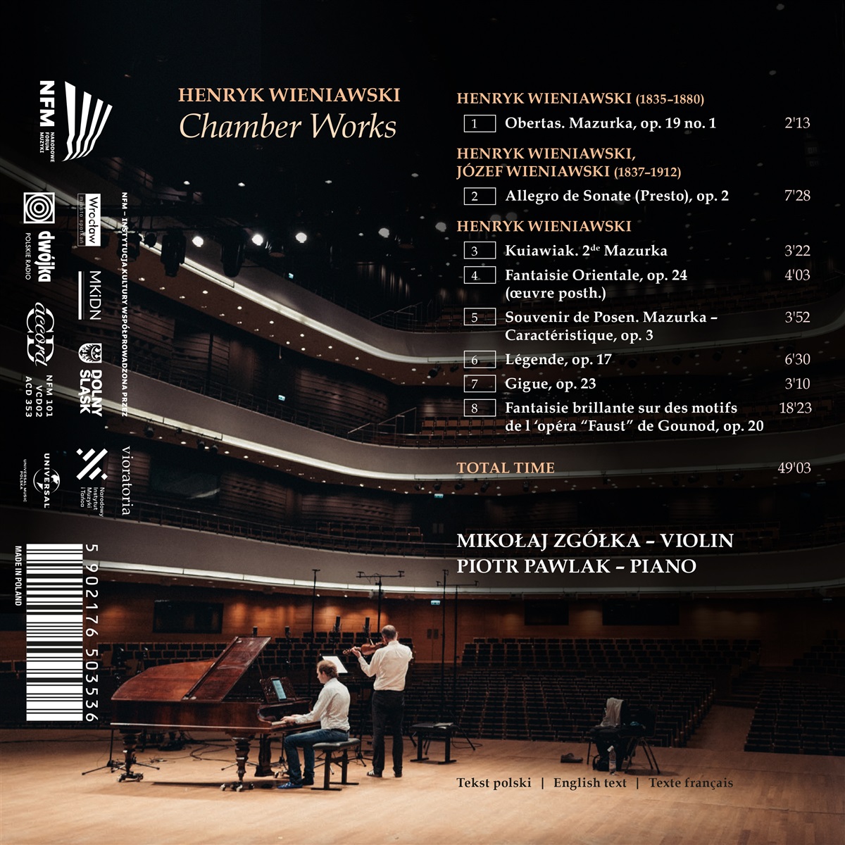Die Auswahl der Stücke auf diesem Album des Geigers Mikołaj Zgółka und des Pianisten Piotr Pawlak soll verschiedene Phasen der kompositorischen Entwicklung von Henryk Wieniawski aufzeigen – vom jugendlichen „Allegro de Sonate“, das er gemeinsam mit seinem Bruder Joseph schrieb und Stanisław Moniuszko widmete, bis hin zu den späten Werken „Fantaisie Orientale“ und „Gigue“. Wieniawski inspirierte seine Zeitgenossen und fasziniert auch heute noch; sein Œuvre bleibt ein Maßstab für die Meisterschaft des Violinspiels. Dank moderner Fortschritte in Technik, Ausrüstung und Pädagogik sind seine Werke zunehmend zugänglich. Dennoch darf man nicht vergessen, unter welchen Bedingungen Wieniawski arbeitete: Er spielte auf Darmsaiten, war ständig auf Reisen, traf die einflussreichsten Persönlichkeiten Europas, wurde von einigen bewundert und von anderen gehasst, konkurrierte mit Bauchrednern und Komikern und begegnete dennoch Legenden wie Franz Liszt, Charles de Bériot, Richard Wagner, Karol Lipiński und Stanisław Moniuszko. Mikołaj Zgółka spielt eine Violine von Raffaele & Antonio Gagliano aus Neapel aus dem Jahr 1839. Piotr Pawlak spielt ein Blüthner-Klavier aus dem Jahr 1853.