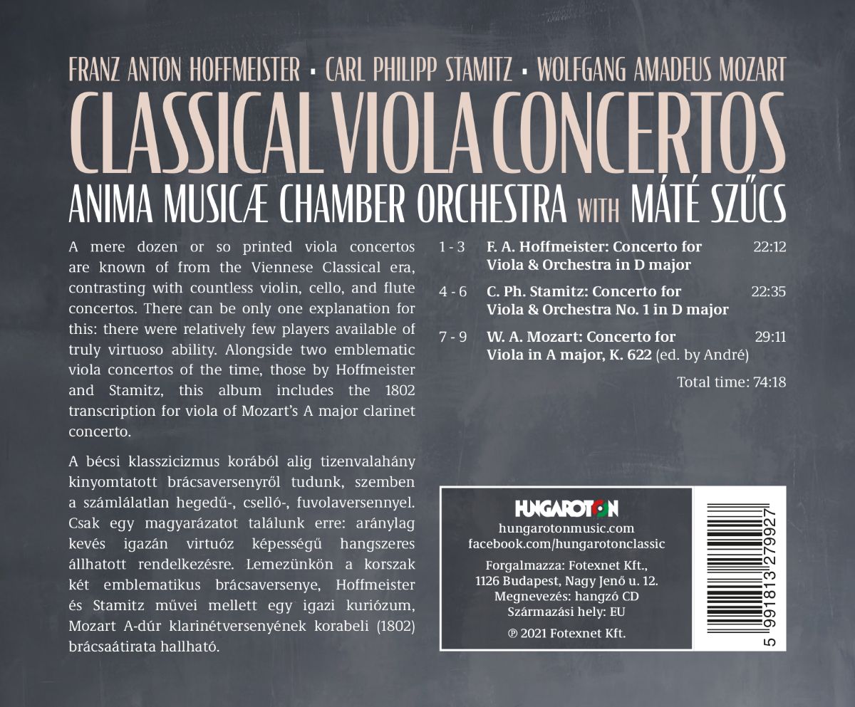 Bevor die Bratsche zum Treppenwitz der klassischen Musikwelt wurde (warum eigentlich?), war sie Ende des 18. Jahrhunderts ein durchaus respektables Soloinstrument, für das eine Reihe exzellenter Konzerte geschrieben wurden. Der ungarische Bratschist Máté Sz?cs hat mit dem Anima Musicæ Chamber Orchestra unter der Leitung von László G. Horváth die Violakonzerte von Franz Anton Hoffmeister und Carl Philipp Stamitz aufgenommen. Außerdem ist eine zeitnahe Transkription (1802) für Viola des Klarinettenkonzerts in A-Dur, KV 622 (1791) von Wolfgang Amadeus Mozart zu hören.