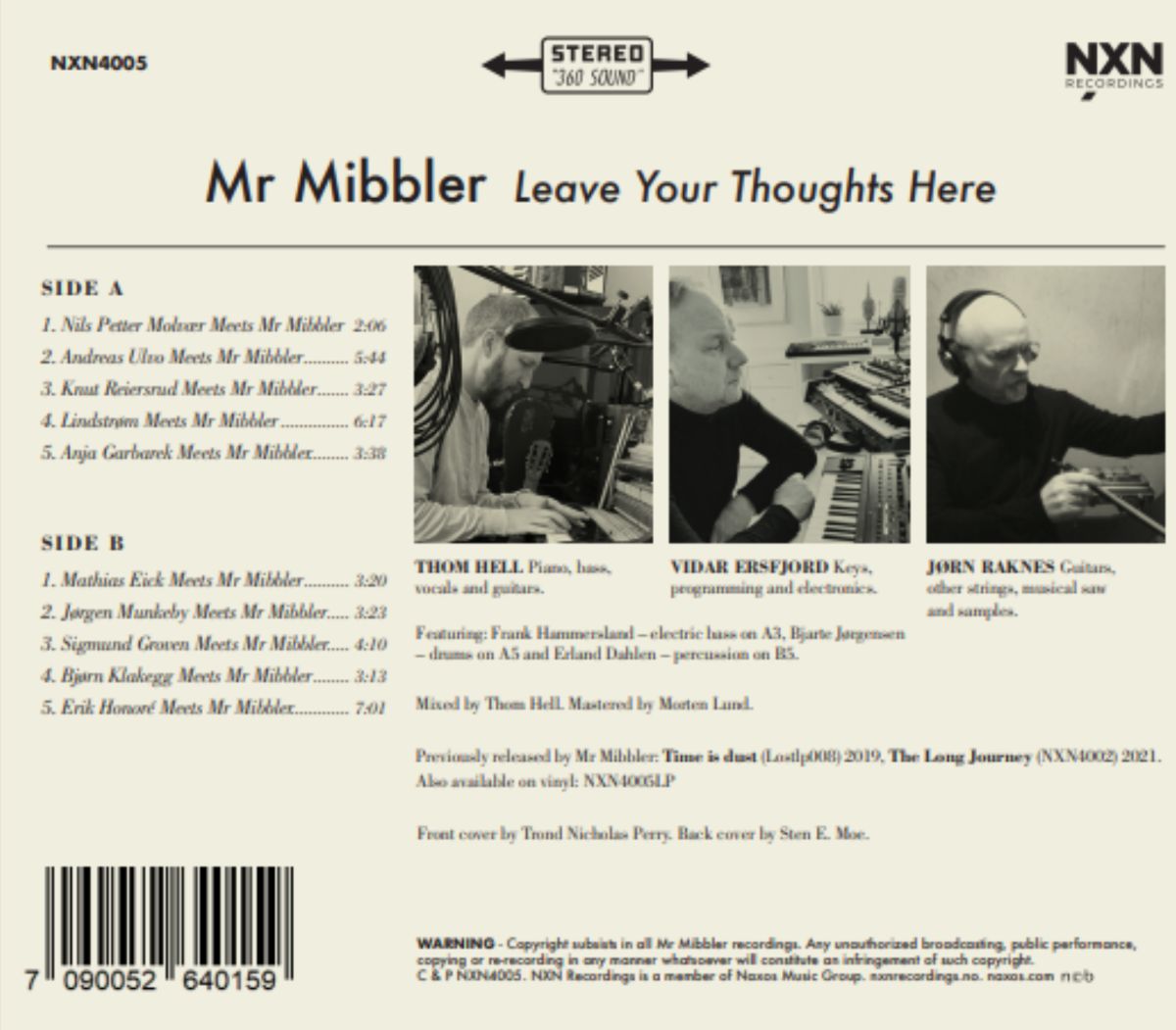 Für das Album „Leave Your Thoughts Here“ ist es dem norwegischen Trio Mr Mibbler gelungen, einige der besten und bekanntesten norwegischen Jazz- und Rockmusik-Größen für ihr Projekt zu gewinnen. Die Gäste und ihr spezifischer Sound waren die Inspiration für die Tracks, die Songs wurden um ihre Beiträge modelliert. Unter ihnen befinden sich die Sängerin Anja Garbarek, der Saxofonist Jørgen Munkeby (Shining), der Pianist Andreas Ulvo und der Trompeter Nils Petter Molvær. Die Bandbreite der Gäste macht aus „Leave Your Thoughts Here“ eine musikalische Reise durch unterschiedlichste Stimmungen und Genres.