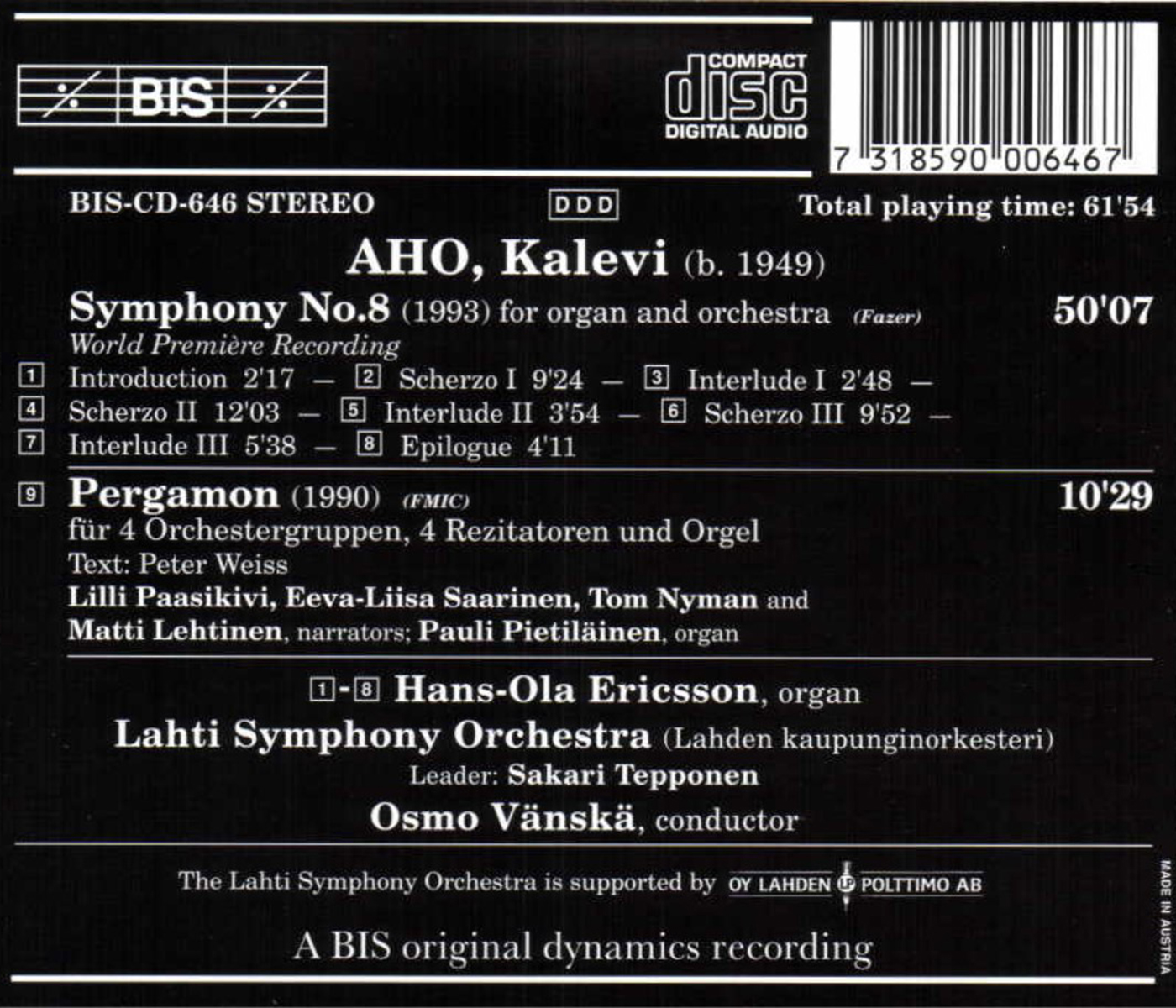 Ericsson, Hans-Ola / Lahti Symphony Orchestra / Lehtinen, Matti / Nyman, Tom / Paasikivi Lilli / Pietilainen, Pauli / Saarinen, Eeva-Liisa / Vänskä, Osmo