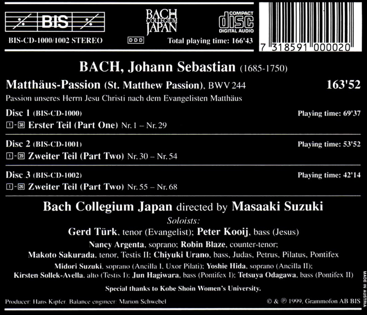 Argenta, Nancy / Bach Collegium Japan / Bach Collegium Japan Chorus / Blaze, Robin / Hagiwara, Jun / Hida, Yoshie / Kooij, Peter / Odagawa, Tetsuya / Sakurada, Makoto / Sollek, Kirsten / Suzuki, Masaaki / Suzuki, Midori / Türk, Gerd / Urano, Chiyuki