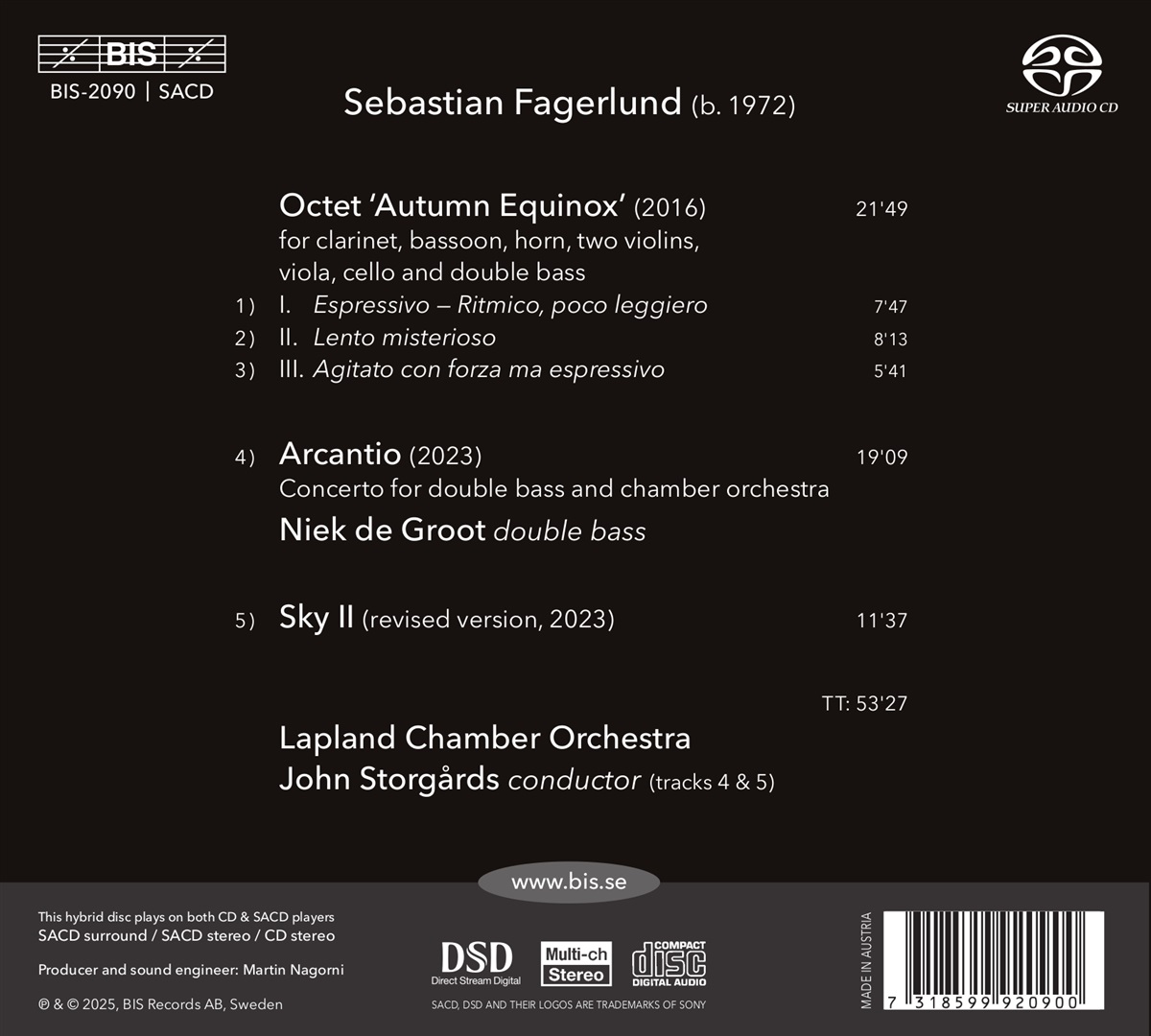 Der Titel von Sebastian Fagerlunds Oktett „Autumn Equinox“ leitet sich von seiner Verbindung zu seiner Oper „Autumn Sonata“ ab, die auf dem Film von Ingmar Bergman basiert. Einige der Stimmungen und das musikalische Material der Oper tauchen im Oktett auf, als eine Art Reflexion. Mit der Instrumentierung von Schuberts berühmtem Oktett im Hinterkopf hat Fagerlund ein intensives, manchmal fast explosives Werk geschaffen. Für „Arcantio“, ein für Niek de Groot komponiertes und ihm gewidmetes Kontrabasskonzert in Variationsform, stellte sich Fagerlund eine musikalische Atmosphäre aus einer fernen, archaischen Zeit vor. Während des gesamten Konzerts führt der Solist das Orchester ständig in neue Richtungen – mal virtuos, mal meditativ, wie in Trance. „Sky II“, ursprünglich für ein Barockensemble komponiert, besteht aus einem einzigen Satz, der eine schnelle und fließende, fast spielerische Musiksprache präsentiert. Der musikalische Ausdruck verbindet tanzartige Rhythmen, Minimalismus und feldartige Klanglandschaften, die den Zuhörer mitreißen. Der schnelle Fluss der Musik wird nur durch eine wiederholte durchscheinende Harmonie unterbrochen, die auch das Werk eröffnet und abschließt. John Storgårds, der Chefdirigent des Turku Philharmonic Orchestra, ist mit Fagerlunds Werk vertraut und hat bereits die Oper „Herbstsonate“ aufgenommen, dirigiert das Lapland Chamber Orchestra in zwei Werken, während das Oktett von Mitgliedern des Orchesters gespielt wird.
