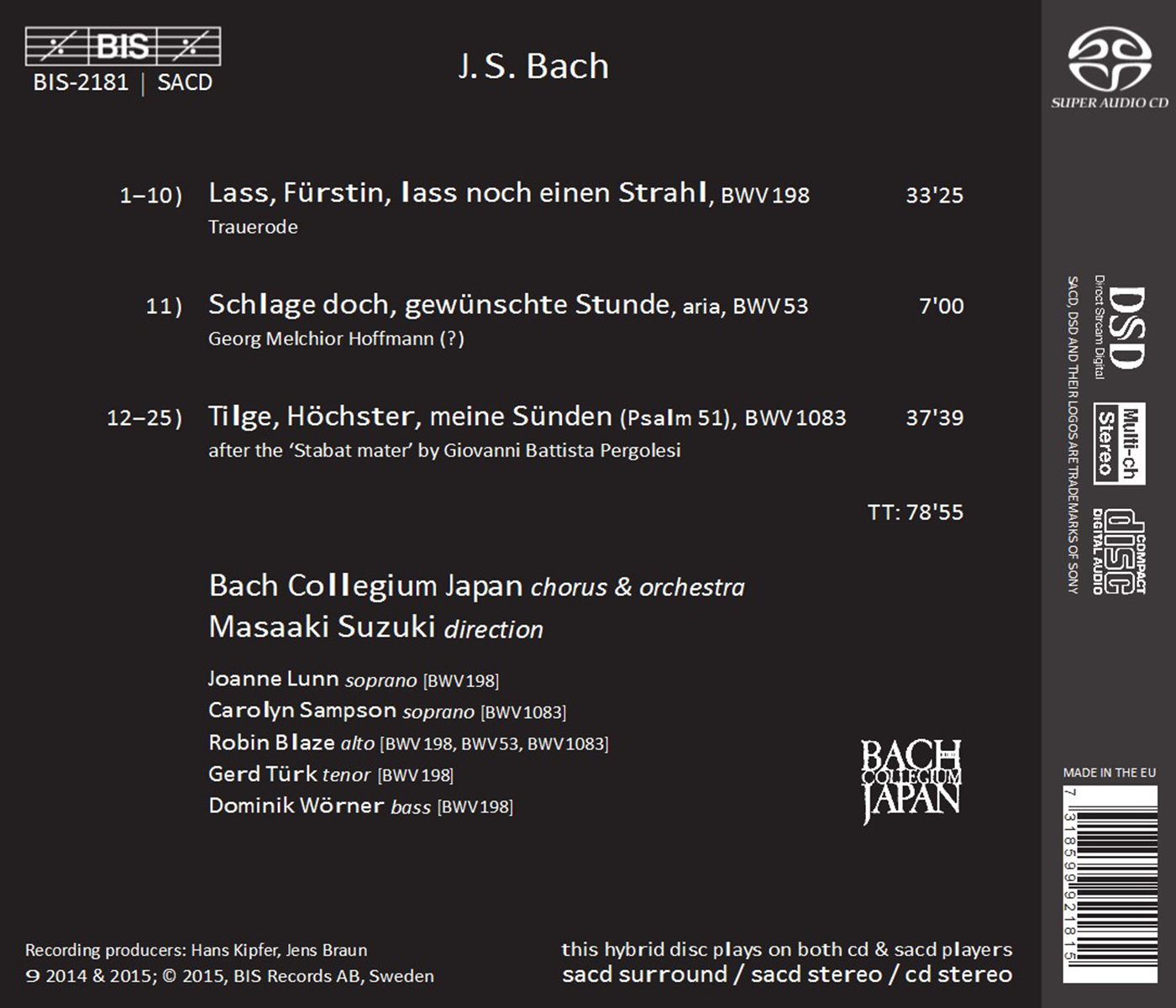 Bach Collegium Japan / Bach Collegium Japan Chorus / Blaze, Robin / Lunn, Joanne / Sampson, Carolyn / Suzuki, Masaaki / Türk, Gerd / Wörner, Dominik