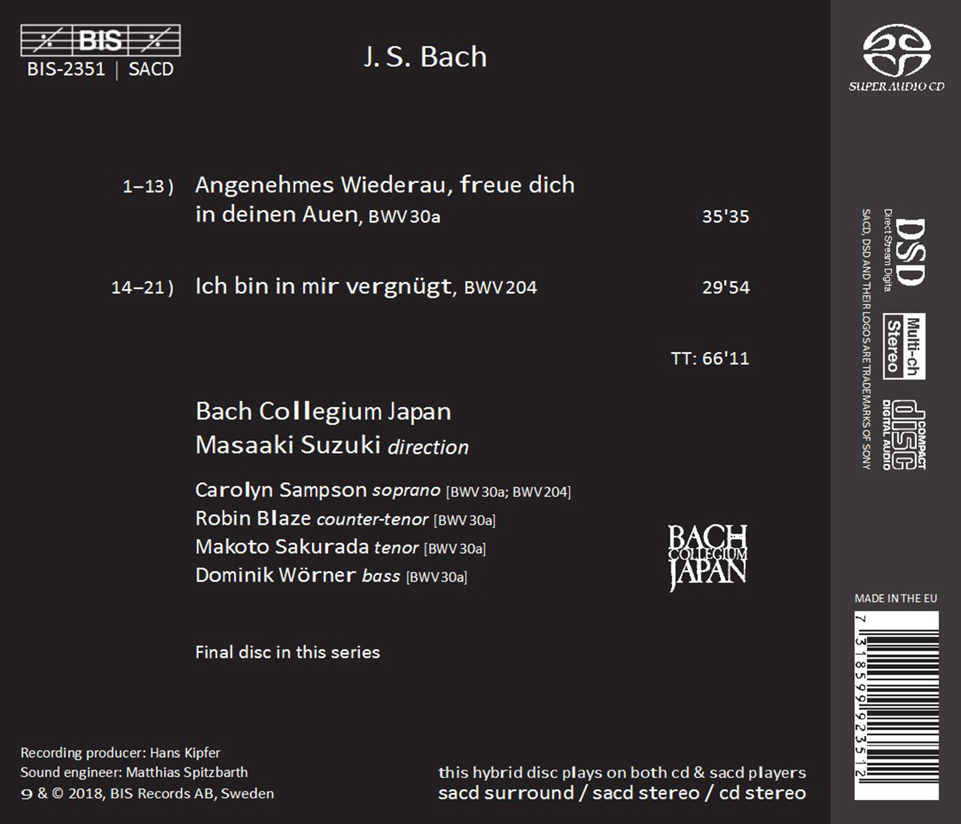 Bach Collegium Japan / Bach Collegium Japan Chorus / Blaze, Robin / Sakurada, Makoto / Sampson, Carolyn / Suzuki, Masaaki / Wörner, Dominik