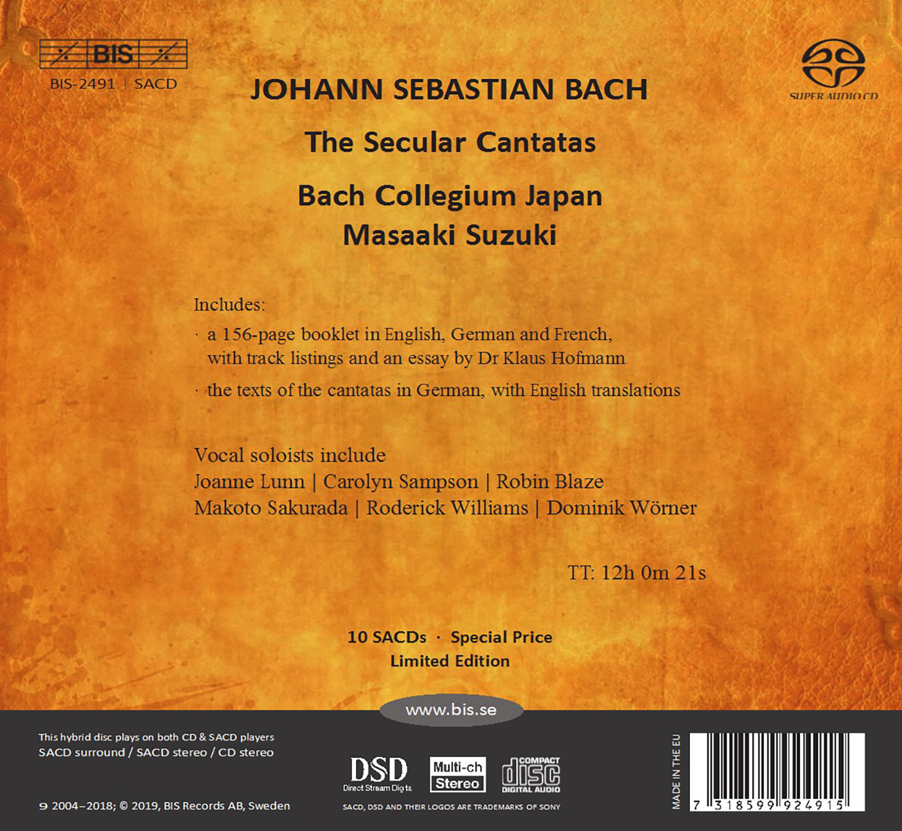 Aoki, Hiroya / Bach Collegium Japan / Bach Collegium Japan Chorus / Blaze, Robin / Blažíková, Hana / Daniels, Charles / Erdmann, Mojca / Fukukawa, Nobuaki / Guillon, Damien / Immler, Christian / Junker, Sophie / Lattke, Wolfram / Lunn, Joanne / Nakashima, Katsuhiko / Phan, Nicholas / Sakurada, Makoto / Sampson, Carolyn / Sannomiya, Masamitsu / Schreckenberger, Stephan / Suga, Kiyomi / Suzuki, Masaaki / Terakado, Ryo / Türk, Gerd / Williams, Roderick / Wörner, Dominik