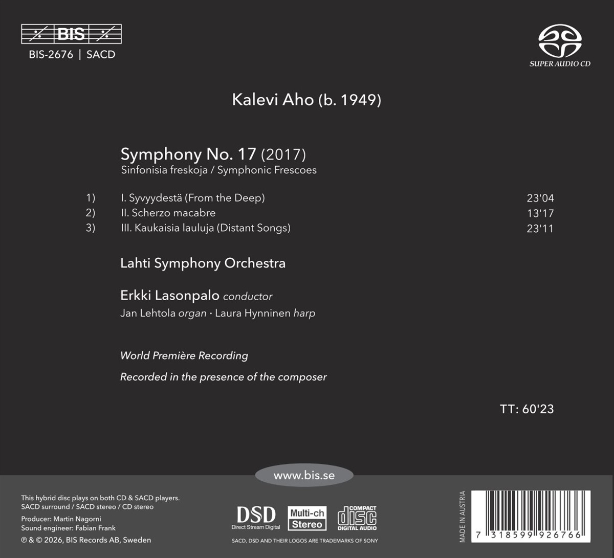 Der ausgesprochen produktive finnische Komponist Kalevi Aho widmet sich regelmäßig groß angelegten Kompositionen, in denen er sein gesamtes künstlerisches Können unter Beweis stellt. Die Sinfonie Nr. 17 ist ein Beispiel für diese Tendenz und stellt sein bislang ambitioniertestes Orchesterwerk dar. Die Sinfonie erfordert ein großes Orchester, in dem auch weniger gebräuchliche Instrumente wie das Lupophon, eine Variante der Baritonoboe, und das Contraforte, ein akustisch verstärktes Kontrafagott, zum Einsatz kommen. Der erste Satz, „From the Deep“, der auch als eigenständige sinfonische Dichtung aufgeführt werden kann, schafft eine düstere und tiefgründige Atmosphäre. Der zweite Satz, „Scherzo macabre“, suggeriert einen makabren Tanz des Todes. Das Finale, „Distant Songs“, zeichnet sich durch musikalische Wechsel aus, die an ferne Zeiten, Tänze und Lieder erinnern, bevor es schließlich in die Gegenwart zurückkehrt. Nach ihrer triumphalen Uraufführung im Jahr 2019 wurde die Sinfonie sofort als Meisterwerk innerhalb des Œuvres von Kalevi Aho gefeiert. Das Lahti Symphony Orchestra unter der Leitung von Erkki Lasonpalo war der Interpret dieser Weltersteinspielung. Der Komponist wohnte der Aufnahme bei.