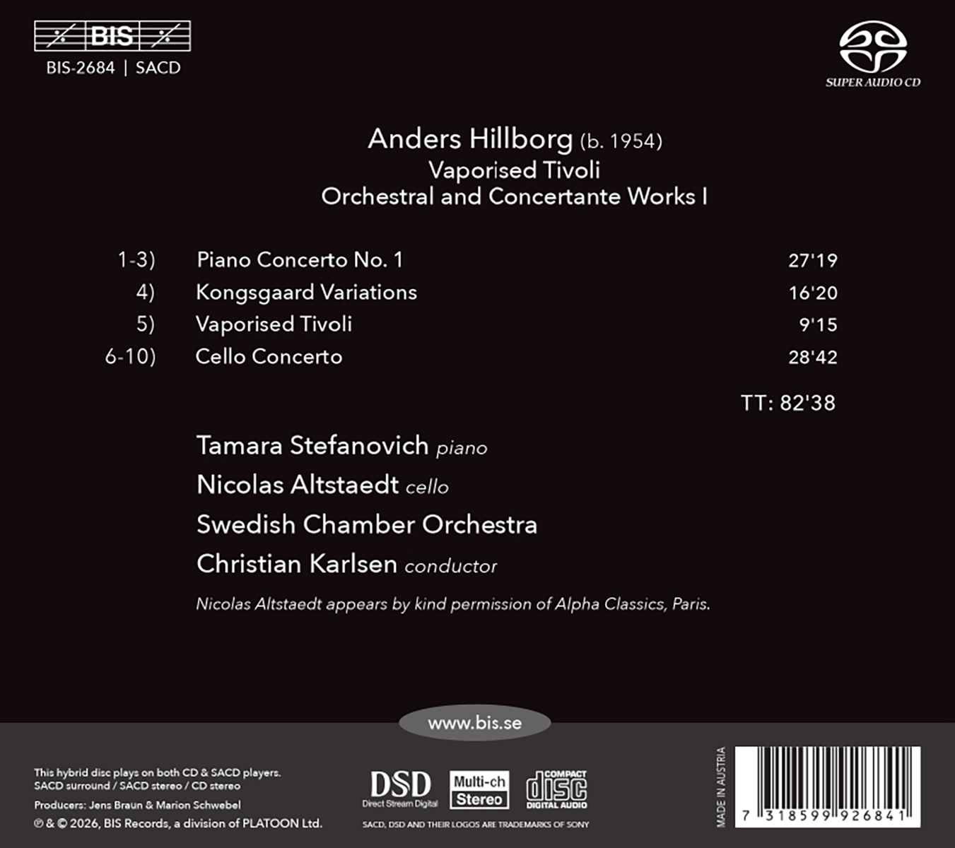 Nach seiner von der Kritik gefeierten Einspielung der fünf Sinfonien von Galina Ustwolskaja nimmt sich Dirigent Christian Karlsen zusammen mit dem Swedish Chamber Orchestra nun die orchestralen und konzertanten Werke von Anders Hillborg vor, Schwedens meistgespieltem noch lebenden Komponisten. Die Aufnahme beginnt mit dem Klavierkonzert Nr. 1, einem hyperaktiven und virtuosen Werk voller filigraner Details, das hier von einer der führenden Interpretinnen des zeitgenössischen Klavierrepertoires, Tamara Stefanovich, gespielt wird. Ebenfalls auf dem Programm steht das Cellokonzert, das sich durch die Intimität der Partitur und eine direkte und minimierte Einfachheit des Ausdrucks auszeichnet, gespielt von Nicolas Altstaedt - dem Widmungsträger des Werks und einem der gefragtesten und vielseitigsten Künstler der Gegenwart. Ebenfalls auf dem Programm: die „Kongsgaard-Variationen“, eine meditative Komposition, die auf der „Arietta“ aus Beethovens Klaviersonate op. 111 basiert, und „Vaporised Tivoli“, eine rauschhafte und halluzinatorische Heraufbeschwörung einer Kirmes. Hillborgs Musik begeistert Musiker und Musikliebhaber auf der ganzen Welt durch ihre tiefe Ausdruckskraft, ihre unbändige Energie und ihre Liebe zum Absurden und Unerwarteten, und diese Aufnahme ist eine hervorragende Einführung in die faszinierende Welt dieses einzigartigen Komponisten.