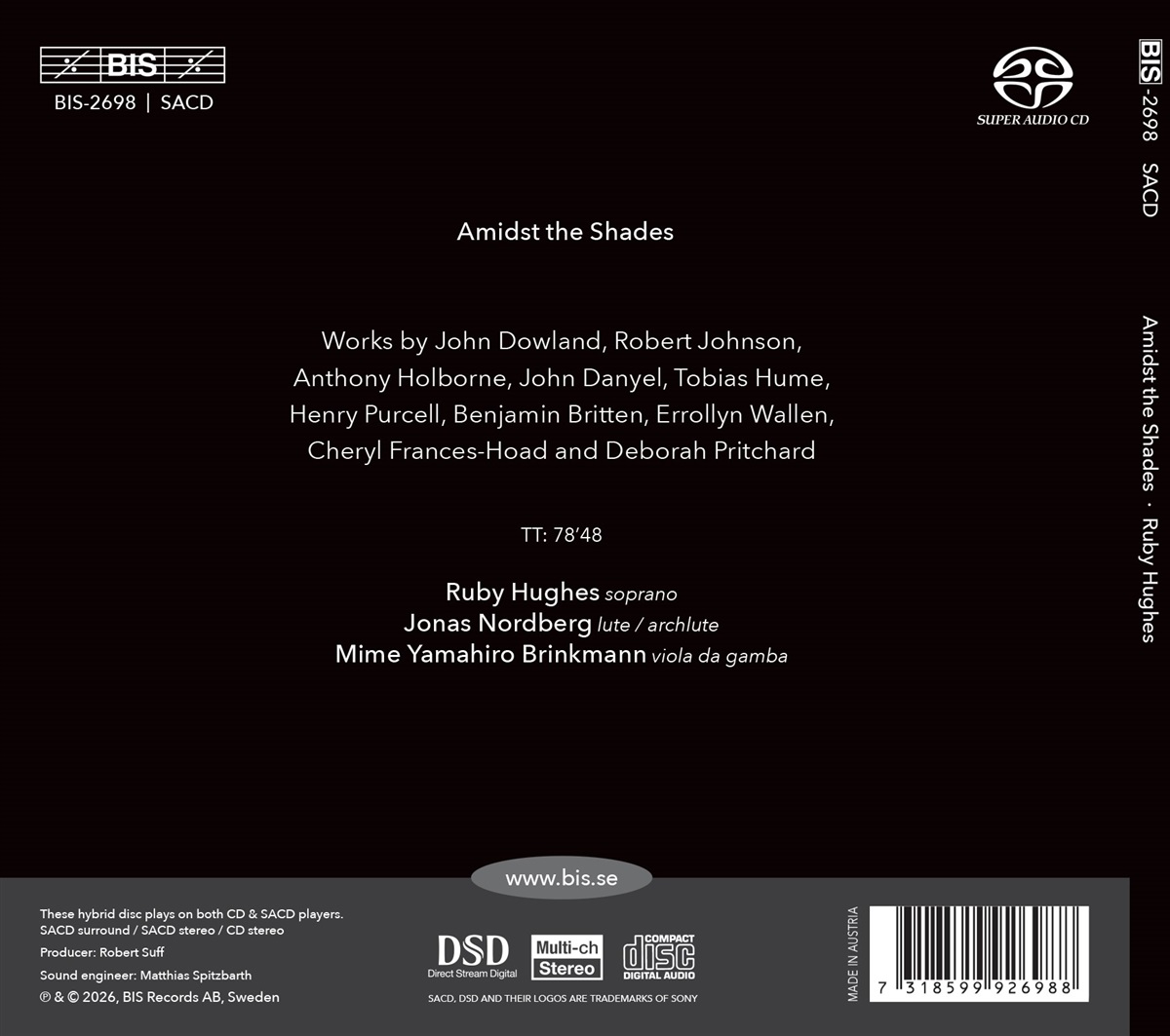 Die Sopranistin Ruby Hughes, die für ihr tiefes ‚Verständnis und die Eleganz‘ (Gramophone) ihrer Kunst gefeiert wird, verfügt über eine bemerkenswerte Diskografie mit Recitals, die die exquisite Schönheit ihrer Stimme zur Geltung bringen. Sie ist besonders bekannt für ihre sorgfältig zusammengestellten Programme, die Werke aus verschiedenen Epochen miteinander verbinden. In „Amidst the Shades“ trifft Hughes erneut auf den Gambisten Mime Yamahiro Brinkmann und den Lautenspieler Jonas Nordberg – dieselbe inspirierende Klangkonstellation, die zum Erfolg von „Heroines of Love and Loss“ beigetragen hat. Dieses neue Recital erkundet ihre gemeinsame Leidenschaft für elisabethanische Musik, die als Katalysator für die Entstehung des Programms diente. Die kontemplativen und melancholischen Lieder von John Dowland bilden die Grundlage, gefolgt von Werken von Robert Johnson und John Danyel, verwoben mit Henry Purcells intimen Vokalstücken. Um das Repertoire für Laute und Gesang weiter zu bereichern, gab Hughes bei Errollyn Wallen und Deborah Pritchard neue Werke in Auftrag, die auf Texten von William Shakespeare basieren. Außerdem erhielt sie von Cheryl Frances-Hoad die Erlaubnis, eine ihrer bestehenden Kompositionen für dieses einzigartige Ensemble zu arrangieren. „Amidst the Shades” verspricht ein Recital voller nuancierter Ausdruckskraft und zarter Klangfarben.
