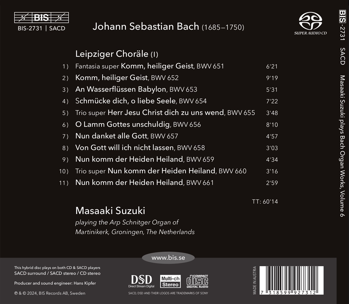 Der sechste Teil der hochgelobten Gesamtausgabe der Orgelwerke von Johann Sebastian Bach von Masaaki Suzuki präsentiert die ersten elf Stücke aus einem Manuskript, das seitdem als „Leipziger Choräle“ bekannt ist. Diese Sammlung, die um 1739 entstand, ist insofern ungewöhnlich, als sie keine neuen Kompositionen enthält, sondern vielmehr Bearbeitungen von Orgelchorälen aus den Jahren 1708–17, als Bach in Weimar lebte.