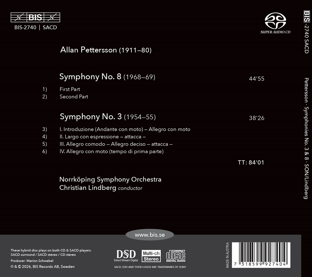 Seit 2010 verfolgen Christian Lindberg und das Norrköping Symphony Orchestra ein einzigartiges und ehrgeiziges Projekt: die vollständige Aufführung und Aufnahme aller Orchesterwerke von Allan Pettersson, dem schwedischen Meister der Sinfonik, der für seine zutiefst persönlichen und emotional aufgeladenen Kompositionen bekannt ist. Die 1956 uraufgeführte Sinfonie Nr. 3 ist innerhalb von Petterssons umfangreichem sinfonischem Schaffen einzigartig, da sie seine einzige Sinfonie in vier Sätzen ist und einer eher traditionellen Struktur folgt. Obwohl es sich um ein Frühwerk handelt, das Einflüsse von Dmitri Schostakowitsch, Jean Sibelius und Gustav Mahler widerspiegelt, ist es keineswegs ein unbedeutendes Werk. Auch wenn die lyrischen Passagen, die später seinen Stil prägen sollten, noch nicht voll entwickelt sind, bietet die Sinfonie eine prägnante und scharf gezeichnete musikalische Landschaft, die sowohl beeindruckend als auch auffallend originell ist. Die 1972 uraufgeführte Sinfonie Nr. 8 ist wohl Petterssons berühmteste und am häufigsten aufgeführte Sinfonie. Ihre ausgedehnten, oft als ‚frei‘ oder ‚unendlich‘ beschriebenen Melodien vermitteln den Eindruck einer grenzenlosen Fortsetzung, doch das Werk ist alles andere als ruhig. Wie für Pettersson charakteristisch, besitzt die Sinfonie einen starken autobiografischen Charakter. Mit seinen eigenen Worten: ‚Das Werk, an dem ich arbeite, ist mein eigenes Leben, das gesegnete und das verfluchte: Ich widme mich ihm, um das Lied wiederzuentdecken, das die Seele einst sang.‘