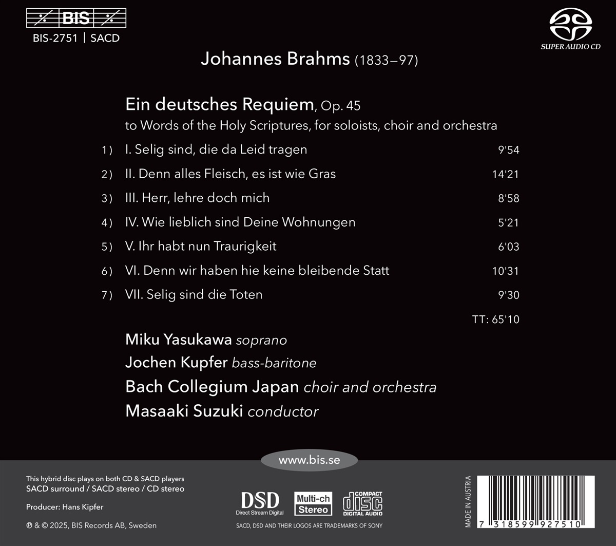 Bevor Johannes Brahms mit seinen Sinfonien die Konzertsäle eroberte, machte er sich als Chorleiter einen Namen. Er leitete Gesangsensembles in seiner Heimatstadt Hamburg, in Detmold und Wien und bereicherte das Repertoire mit seiner eigenen Musik. Das zwischen 1865 und 1868 komponierte „Ein deutsches Requiem“ ist sein umfangreichstes Chorwerk und ein Meilenstein in seiner künstlerischen Entwicklung. In diesem Werk kombiniert Brahms Textpassagen aus dem Alten und Neuen Testament auf unkonventionelle Weise: Der Angesprochene von Text und Musik ist nicht mehr der Verstorbene, für dessen Erlösung wir beten, sondern der Überlebende, der getröstet werden soll. Brahms wandte sich damit von kirchlichen Konventionen ab und schuf ein sehr untypisches Requiem, das nichts mit der oft vertonten lateinischen Requiem-Messe der katholischen Kirche zu tun hat. Stattdessen war es von Anfang an für den Konzertsaal oder Kirchenkonzerte konzipiert. Musikalisch schöpft das Requiem auf höchst persönliche Weise aus früheren Traditionen, bleibt dabei aber fest in einer romantischen Chor-Sprache verankert, die manchmal in üppige Orchesterstrukturen eingebettet ist. Nach unzähligen gefeierten Aufnahmen, die der geistlichen Musik von Bach, Mozart und Beethoven gewidmet sind, präsentieren Masaaki Suzuki und das Bach Collegium Japan nun ihre einzigartige Vision von Brahms' Meisterwerk.