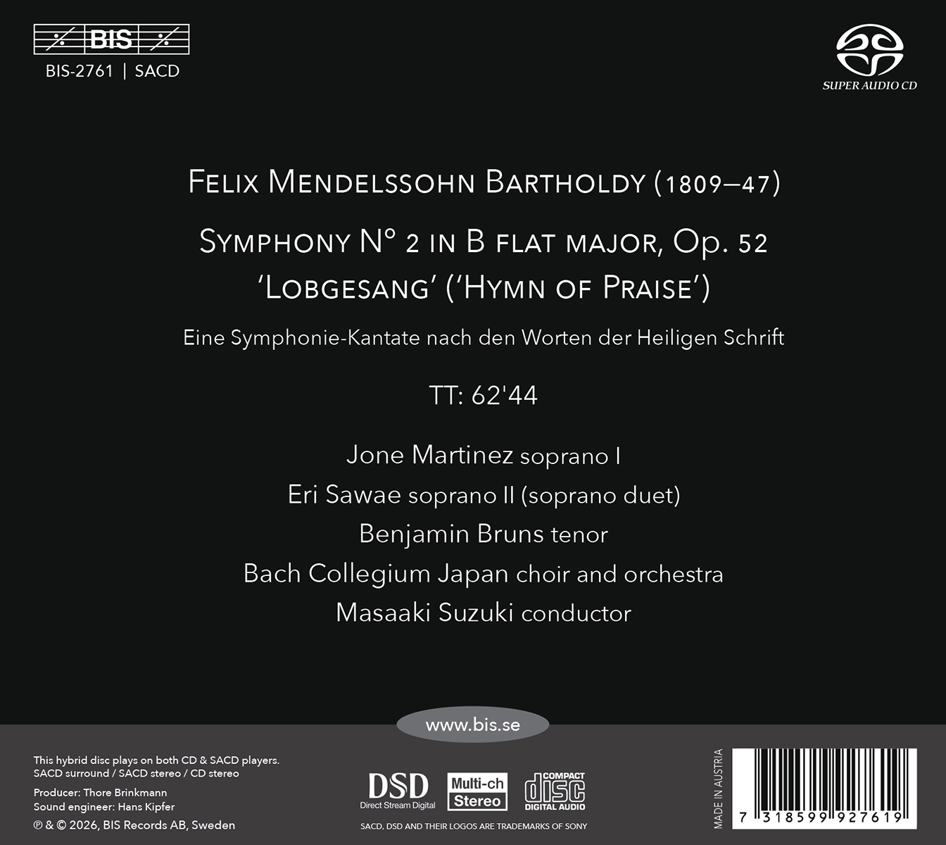 Masaaki Suzuki und das Bach Collegium Japan, bekannt für ihre maßgeblichen Interpretationen der Vokalmusik von Johann Sebastian Bach, haben auch für ihre Aufnahmen bedeutender Chor- und Orchesterwerke, darunter Wolfgang Amadeus Mozarts „Requiem“ und „Messe in c-Moll“, Beethovens „Missa Solemnis“ und „Sinfonie Nr. 9“ sowie Johannes Brahms' „Ein deutsches Requiem“ viel Zuspruch von der Presse erhalten. In ihrem neuesten Projekt widmen sie sich Felix Mendelssohns Sinfonie-Kantate, der Sinfonie Nr. 2 „Lobgesang“. Das für Solisten, Chor und Orchester komponierte Werk besteht aus drei sinfonischen Sätzen und einem Schlusschor – eine Struktur, die deutlich an Beethovens Neunte Sinfonie erinnert. Mendelssohn geht jedoch noch einen Schritt weiter, indem er den abschließenden Kantaten-Teil auf zwei Drittel der Gesamtdauer des Werks ausdehnt. Der Text basiert auf Bibelauszügen und eigens in Auftrag gegebenen Gedichten. Die ersten sinfonischen Sätze, die von der deutschen Romantik geprägt sind, wechseln sich kunstvoll mit choralartigen Passagen ab und stellen eine tiefe Verbindung zur alten Kantatentradition her, die das monumentale Finale prägt. Das Werk wurde in der Thomaskirche in Leipzig (derselben Kirche, in der Mendelssohns Held Johann Sebastian Bach einst tätig war) uraufgeführt und feiert den 400. Jahrestag der Erfindung des Buchdrucks durch Gutenberg. Es war sofort ein durchschlagender Erfolg und wurde schnell zu einem der meistgespielten Werke zu Mendelssohns Lebzeiten.