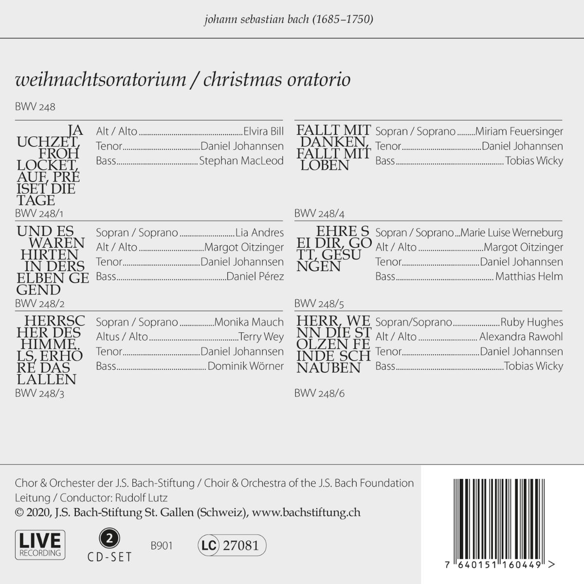 Ein neues Bach'sches Weihnachtsoratorium gegen Jahresende ist sicher per se keine Besonderheit. Diese Neuaufnahme kommt allerdings von der weltweit beachteten Bach-Stiftung aus St. Gallen (Schweiz) und überzeugt durch zügige Tempi, eine sehr hohe Textverständlichkeit von Solisten und Chor, eine vorzügliche instrumentale Begleitung (selbstredend auf historischen Instrumenten) unter der Leitung von Rudolf Lutz und durch die exzellente Akustik der evangelischen Kirche Trogen im schweizerischen Aargau.