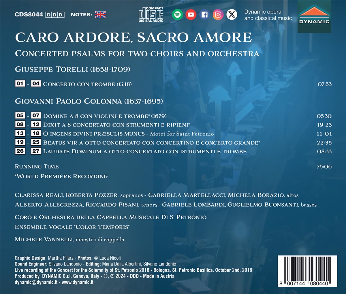 Es musizieren der Coro & Orchestra della Cappella Musicale Arcivescovile della Basilica di San Petronio (also quasi das Hausensemble der erzbischöflichen Basilika) mit dem Ensemble Vocale Color Temporis. Die musikalische Leitung hat Michele Vannelli.