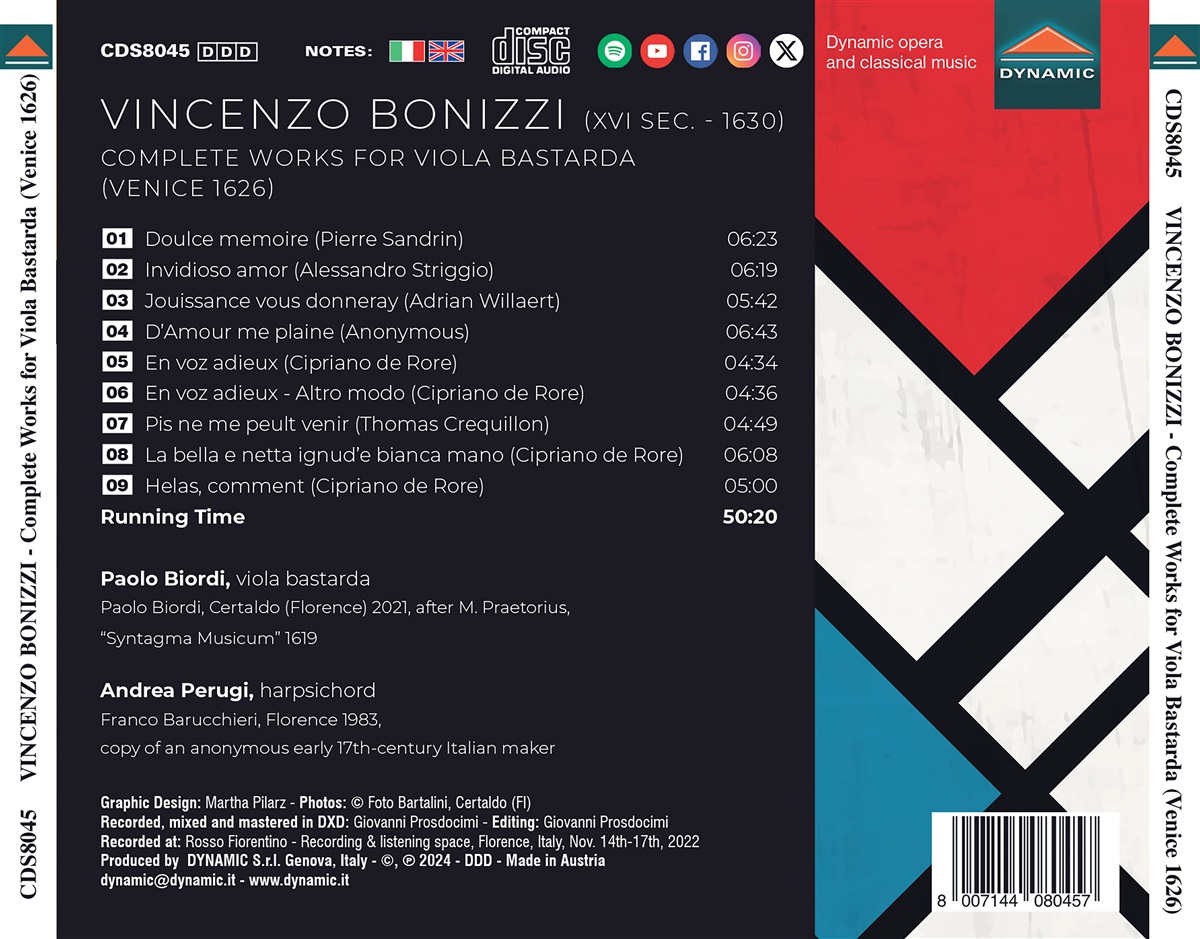 Über Vincenzo Bonizzis Leben ist wenig bekannt, aber er lebte und arbeitete hauptsächlich in Parma und wird von Musikhistorikern für das letzte Werk für die Viola bastarda, das 1626 veröffentlicht wurde, in Erinnerung behalten. Die Viola bastarda wurde als ‚Königin der Instrumente‘ bezeichnet – sie liegt in Bezug auf Größe und Stimmung zwischen Tenor- und Bassgambe. Bonizzis „Alcune opere di diversi auttori“ ist eine Mischung aus Originalmusik und Stücken aus zahlreichen Quellen, die alle von hohem musikalischen Wert und technischer Schwierigkeit sind. Der Gambist Paolo Biordi hat zahlreiche Aufnahmen für Dynamic, Naxos und andere Labels gemacht. Er ist Autor weltbekannter Publikationen, wie z. B. „Metodo progressivo per Viola da Gamba“ und „Viole de Gambe en Italie“. Er ist ein Experte für Viola da Gamba in der musikalischen Ikonografie des 15. bis 17. Jahrhunderts. Andrea Perugi hat mit dem Orchestra Regionale Toscana, dem Teatro Comunale di Firenze sowie mit Claudio Abbado, Cecilia Bartoli und anderen zusammengearbeitet. Er hat für verschiedene Labels Aufnahmen gemacht.