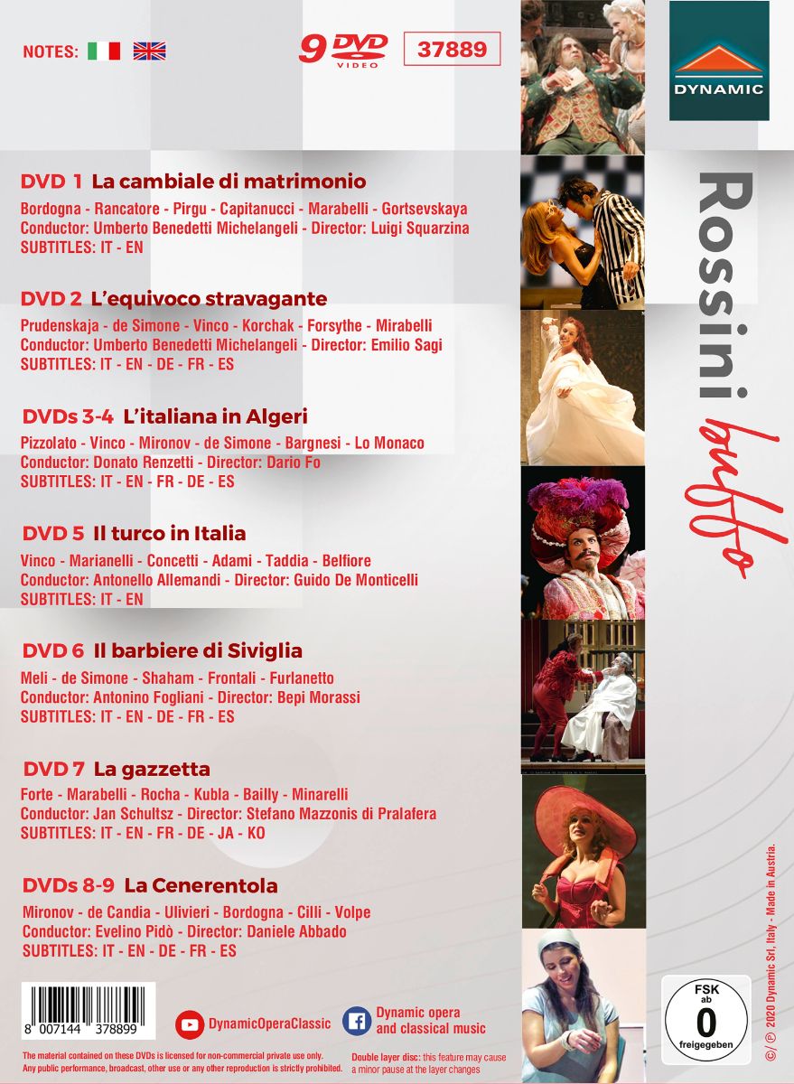 „Rossini buffo“ enthält - wie der Titel vermuten lässt - sieben Opere buffe Rossinis, die zu seinem Kernrepertoire zu zählen sind: „Il Barbiere di Siviglia“, „L'Equivoco stravagante“, „L'Italiana in Algeri“, „La Cenerentola“, „La Gazzetta“, „La Cambiale di matrimonio“ und „Il Turco in Italia“ in exzellenten Inszenierungen von Bepi Morassi, Emilio Sagi, Dario Fo, Daniele Abbado, Stefano Mazzonis di Pralafera, Luigi Squarzina und Guido De Monticelli