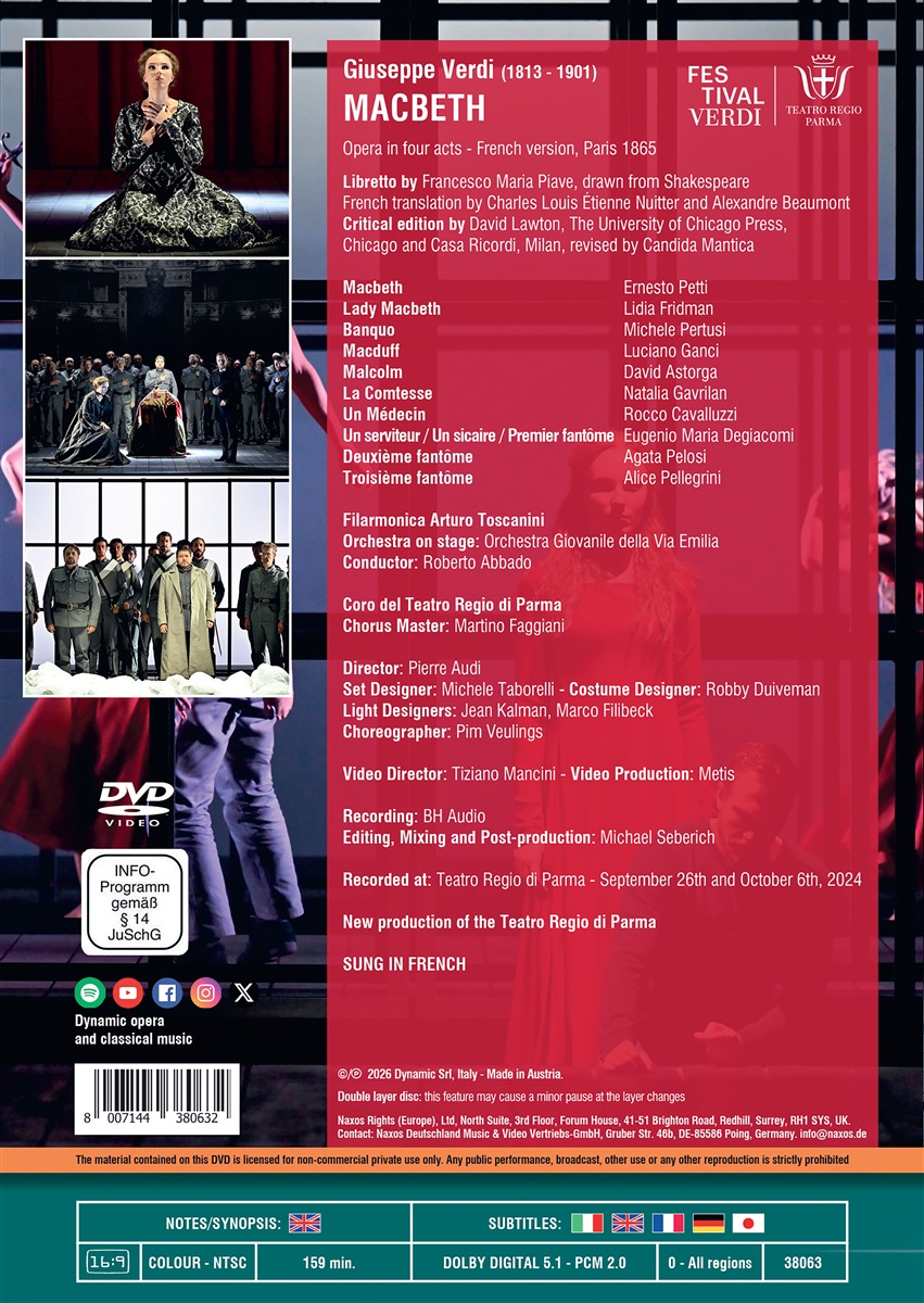 „Macbeth“ ist eine der größten Tragödien Shakespeares. Sie erzählt die Geschichte eines mächtigen Paares, das von Hexerei und Aberglauben angetrieben wird und von dem Wunsch besessen ist, den Thron mit Gewalt, ja sogar durch Mord, zu erobern. Diese französische Version - die Weltpremiere auf Video in französischer Sprache - von Giuseppe Verdis Oper führt uns in eine Welt, in der sich Ungeheuer verbergen, die zu den schlimmsten Gräueltaten fähig sind und in einigen der blutigsten und intensivsten Musikpassagen des Komponisten dargestellt werden. Die Inszenierung der französischen Version von 2024 ist eine echte Rarität auf der Bühne und wurde für ihre kraftvollen Gesangsleistungen und die hervorragende schauspielerische Leistung der hervorragenden Besetzung um Ernesto Petti, Lidia Fridman, Michele Pertusi und Luciano Ganci gelobt. Die Filarmonica Arturo Toscanini wird von Roberto Abbado dirigiert, der vom Verband der italienischen Musikkritiker mit dem renommierten Premio Abbiati ausgezeichnet wurde. Abbado wurde auch für seine andere „Macbeth“-Aufnahme mit demselben Orchester gelobt.