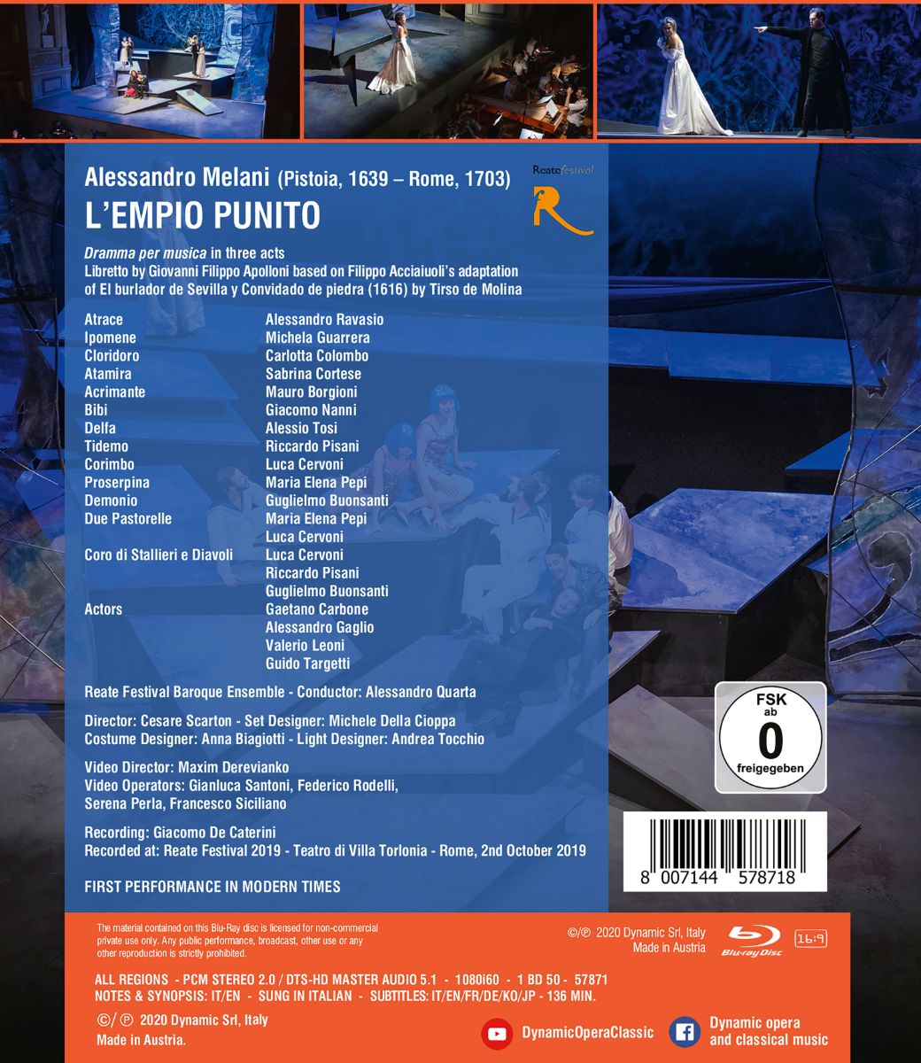 L'Empio Punito“ von Alessandro Melani (1639–1703) ist die erste Oper, in der die Figur des ‚Don Giovanni‘ auftritt. Sie wurde am 17. Februar 1669 in Rom als Auftragsarbeit einiger Aristokraten (darunter Christina von Schweden) uraufgeführt und geriet bald danach wieder in Vergessenheit. Erst zu Beginn der 2000er wurde die Oper konzertant zunächst in Leipzig, dann in Auszügen in Montpellier und Turin und schließlich 2019, 350 Jahre nach ihrer Uraufführung, wieder in Rom, am historischen Teatro di Villa Torlonia inszeniert. Die Geschichte aus dem Theaterstück „El burlador de Sevilla y convidado de piedra“ von Tirso de Molina ist hinlänglich aus den späteren Opernvertonungen von Gazzaniga und vor allem Mozart bekannt: Der über Leichen gehende Acrimante (Don Giovanni) wird für sein zügelloses Leben mit der ewigen Verdammnis bestraft. Das Reate Festival Baroque Ensemble unter der Leitung von Alessandro Quarta und ein Ensemble junger italienischer Stimmen setzen diesen ‚Proto-Don-Giovanni‘ musikalisch packend um. Cesare Scarton inszenierte „L'Empio Punito“ in erstaunlich düsteren Farben.