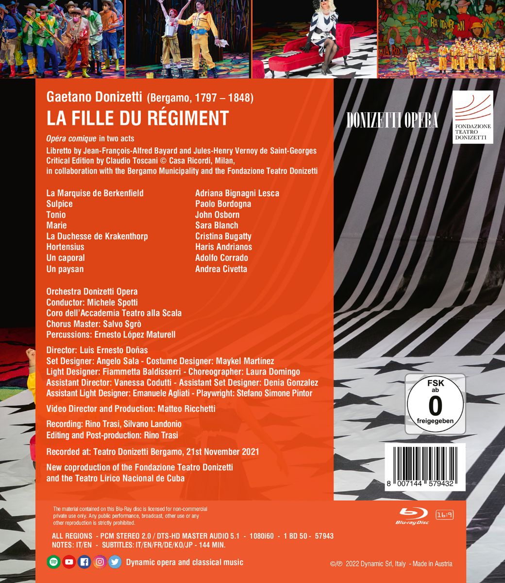 Gaetano Donizettis opera comique "La fille du régiment" wurde seit ihrer Uraufführung 1840 ein Riesenerfolg - und noch heute unterhält die "Regimentstochter" die Zuschauer auf Beste besonders wegen ihrer schwungvollen und rhythmischen Musik. Dabei tritt die Liebesgeschichte, die die Welt des Adels und des Militärs auf Korn nimmt, beinahe in den Hintergrund. Donizetti lässt die Sänger brillieren - allein die erste Arie des Tenors liegt in extrem hoher Lage, enthält neun hohe Cs und forderte nicht nur Luciano Pavarotti oder Juan Diego Florez zu Höchstleistungen heraus. John Osborne und Sara Blanch glänzen in der Aufführung aus dem Teatro Donizetti in Bergamo vom November 2021.