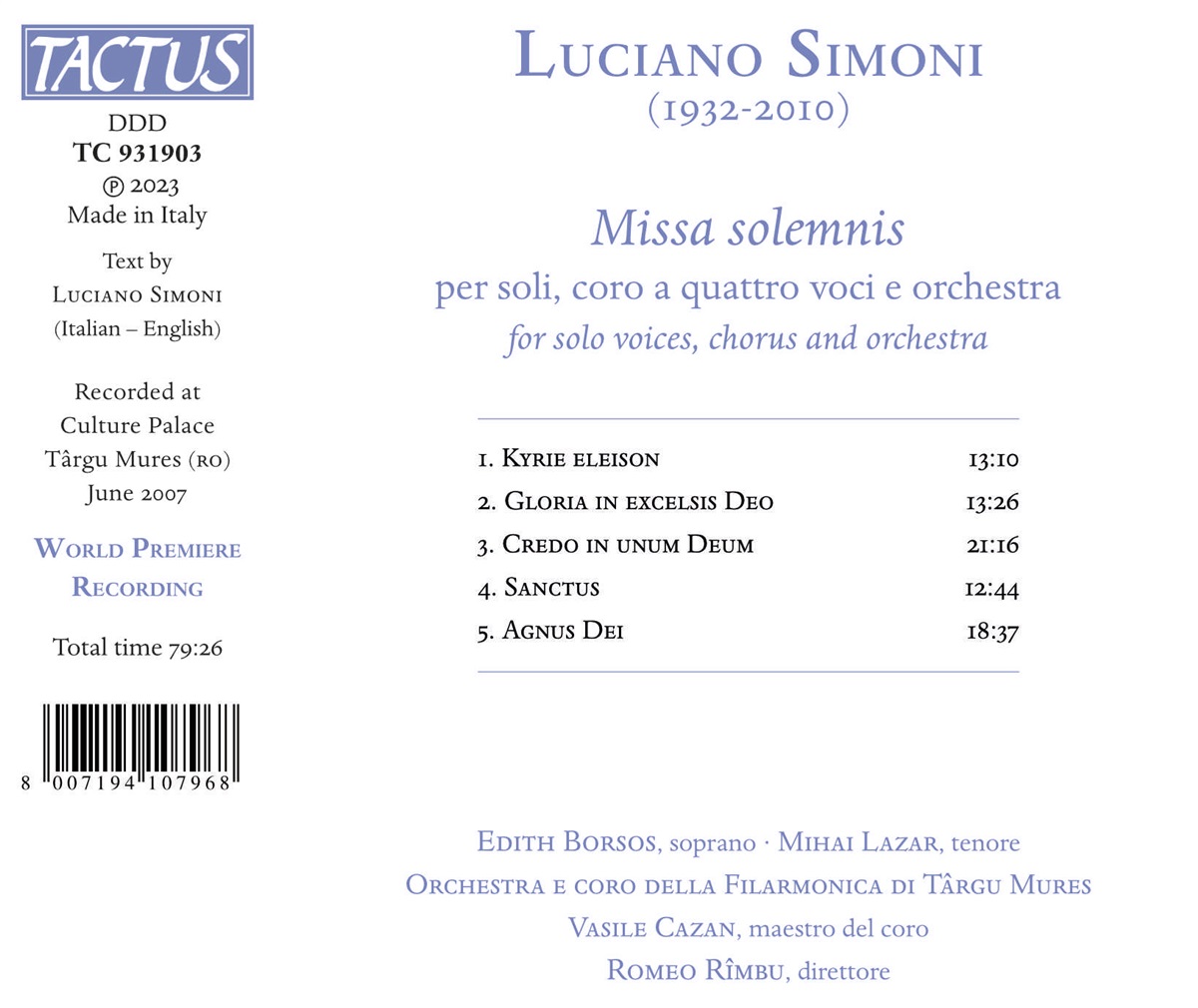 Borsos, Edith / Lazar, Mihai / Orchestra e Coro Della Filarmonica di Targu Mures / Cazan, Vasile / Rimbu, Romeo