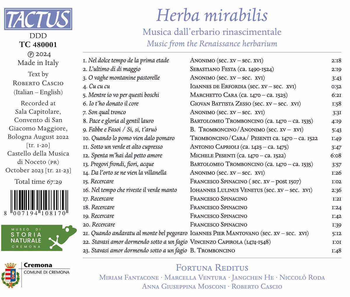 Aus der reichhaltigen Musikszene des frühen 16. Jahrhunderts stammt dieses Repertoire, das die Pflanzenwelt in dem weiten geographischen Horizont besingt, der sich von den grünen Wiesen voller Blumen bis zu den Bergweiden erstreckt, wo Hirten und Hirtinnen spielerisch den Widerhall ihrer eigenen Stimmen zurücksenden. Anspielungen, Lautmalereien, Sprichwörter und Redewendungen, Sprüche, Liebeskummer, Spiele und Tänze zu alten Melodien die Rosen, Gärten, schattigen Wäldern, Zypressen, Triumpf-Lorbeeren, Ackerbohnen und Schoten als Protagonisten sehen. Eine Musik, die mit einfachen Worten (in Vulgärsprache, also dem Italienischen, der Sprache des italienischen Rinascimento) die Fantasie und Vorstellungskraft des Zuhörers anspricht und eine ganzheitliche Welt darstellt, auf deren großem Bühne alles, der Mensch, seine Gefühle und die Natur, miteinander verbunden sind. Diese ganz besondere Verflechtung von Kultur und Musik in der Renaissance wird vom Ensemble Fortuna Reditus unter der Leitung von Roberto Cascio interpretiert, der mit diesem neuen Album sein Studium und seine Wiederentdeckung der alten italienischen Musik nach den zahlreichen von Publikum und Kritikern hochgeschätzten Produktionen fortsetzt.