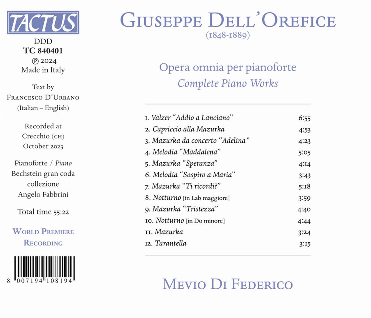 Das Album ist entstanden, um einen großen Musiker aus den Abruzzen, einer italienischen Region, die die italienische Musikkultur maßgeblich geprägt hat, in den Mittelpunkt zu stellen. Das Album ist das Ergebnis einer engagierten historischen Recherche von Professor Francesco D'Urbano, einem Musiker und Wissenschaftler, der sich seit Jahren durch zahlreiche kulturelle Initiativen für die Wiederentdeckung dieser bedeutenden Persönlichkeit einsetzt. Die in öffentlichen und privaten Archiven sowie in verschiedenen Nationalbibliotheken durchgeführten Nachforschungen haben zu einer historischen Neupositionierung der Figur des Musikers und zur Wiederherstellung seiner gesamten gedruckten Produktion geführt. Die Klavierwerke des Komponisten Giuseppe Dell'Orefice werden hier von Mevio di Federico aufgeführt, der in seinem Spiel die Besonderheiten der neapolitanischen Schule des 19. Jahrhunderts und die Einflüsse der großen europäischen Meister herausarbeitet.