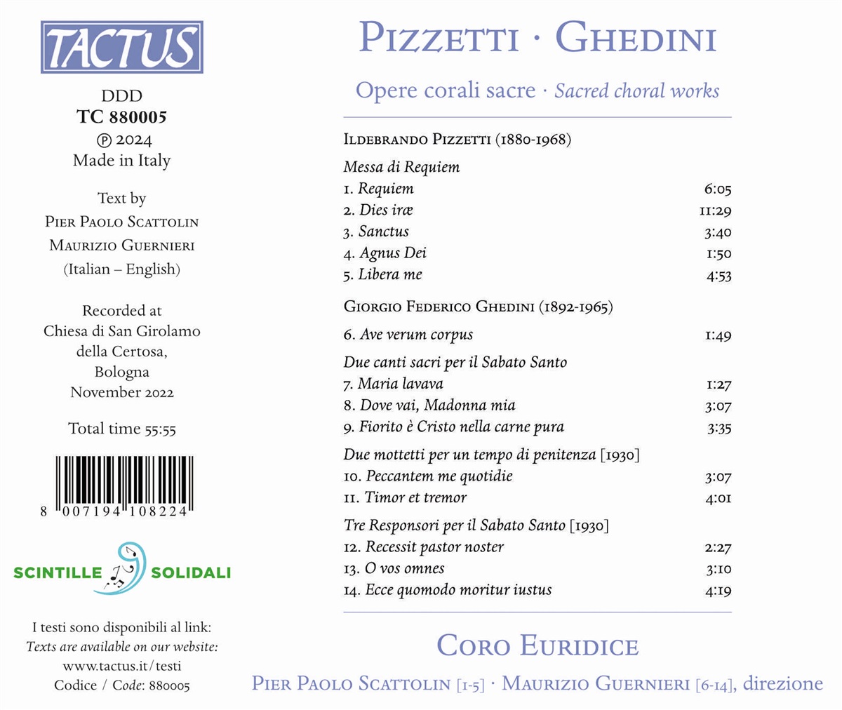 Mit der Veröffentlichung dieses Albums erreicht der Coro Euridice aus Bologna ein wichtiges Ziel in Bezug auf die Verbreitung einiger Chorwerke zweier Autoren, Ildebrando Pizzetti (*Parma 1880; †Rom 1968) und Giorgio Federico Ghed ini (*Cuneo 1892; † Genua Nervi 1965), die an der Spitze der italienischen Chormusik des 20. Jahrhunderts stehen. Leider finden die meisten dieser Meisterwerke nur selten Eingang in Konzertprogramme und sind daher wenig bekannt. Diese Kompositionen sind stilistisch sehr unterschiedlich, aber ihre musikalische Qualität zeichnet ein klares Profil der ausdrucksstarken Tiefe und ästhetischen Konsistenz der italienischen Chormusik aus dem frühen 20. Jahrhundert. Die imposante polyphone Struktur von Pizzettis Requiem und der ‚Neo-Madrigalismus‘ (wie Massimo Mila den Musikstil nannte), den Giorgio Federico Ghedini übernahm, basieren jeweils auf den Anregungen des Gregorianischen Chorals und auf den stilistischen Modulen des kompositorischen Erbes der Renaissance, deren Wiederentdeckung das Fundament dieser Musik bildet.