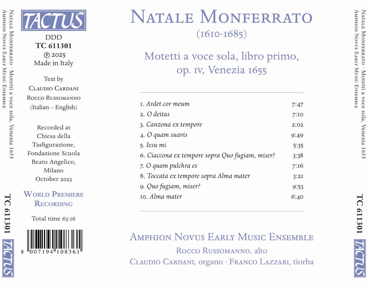 Natale Monferrato lebte im 17. Jahrhundert in Venedig. Er war Sänger an der Basilika San Marco und wurde später dort Kapellmeister und Organist. Ab dem frühen 17. Jahrhundert wurde die polyphone Motette, die in den vorangegangenen Jahrhunderten die sakrale Musik dominiert hatte, sowohl im liturgischen als auch im devotionalen Kontext durch eine neue, schlankere Form ergänzt: die Solomotette. Dadurch konnten Gebete und Meditationen auch an Orten musikalisch begleitet werden, an denen die Aufrechterhaltung eines stabilen polyphonen Chores nicht praktikabel oder wirtschaftlich nicht realisierbar war. Gleichzeitig erhielten Komponisten mehr Freiheit, sich dem aufkommenden „modernen Geschmack” der Zeit anzupassen, der die Ausdruckskraft einer einzelnen Stimme, unterstützt von Orgel oder anderen Continuo-Instrumenten, gegenüber dem kontrapunktischen Zusammenspiel mehrerer Stimmen bevorzugte. Diese moderne Ästhetik legte zunehmend Wert auf die Vermittlung von „Affetti”, die als wesentlich für den wahren Ausdruck eines Textes angesehen wurden. Die Kompositionen von Natale Monferrato, die auf diesem Album vom Ensemble Amphion Novus präsentiert werden, sind eine Erstaufnahme einer speziell für diesen Anlass vorbereiteten Ausgabe und veranschaulichen genau diese Entwicklung.