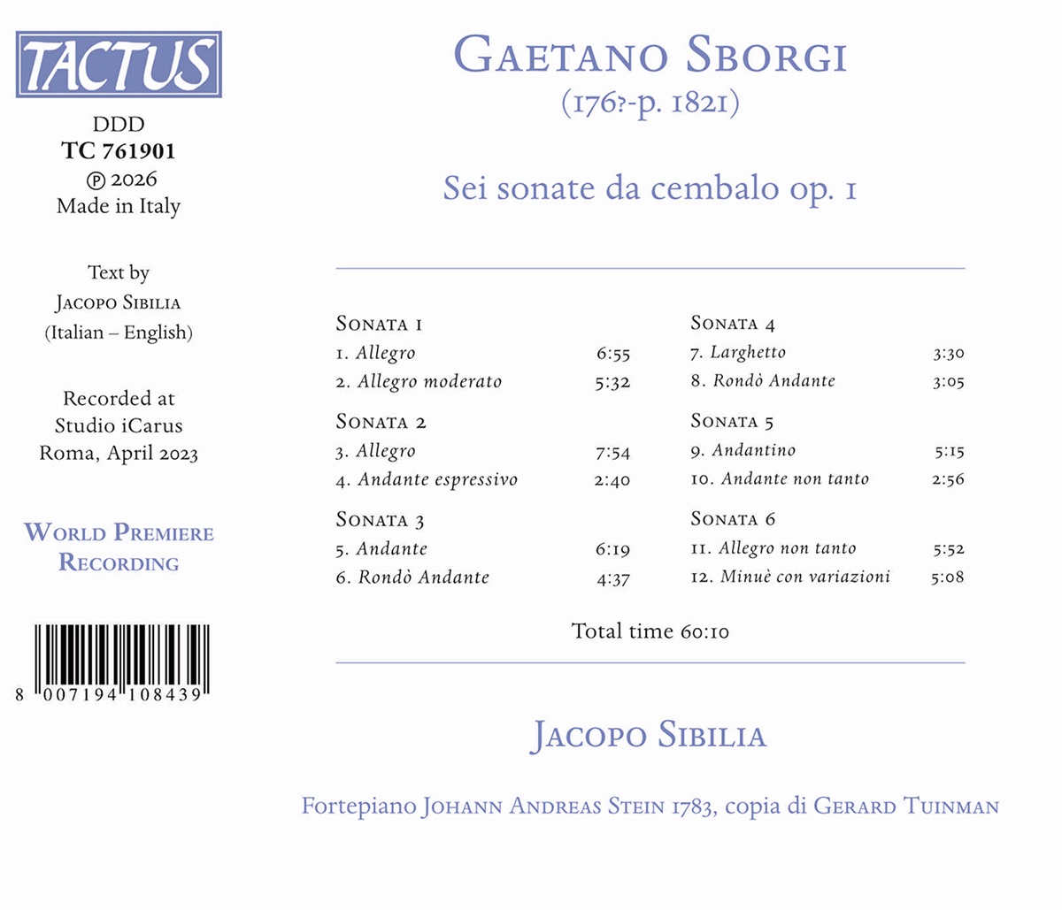 Das genaue Geburts- und Sterbedatum von Gaetano Sborgi, einem Komponisten, der zwischen der zweiten Hälfte des 18. und dem Beginn des 19. Jahrhunderts lebte, ist nicht bekannt. Mit ziemlicher Sicherheit lässt sich jedoch sagen, dass Sborgi in Florenz geboren wurde, da er im Vorwort seiner Sonaten angibt, Florentiner zu sein. Sborgi war Kapellmeister und Klavierlehrer an der Kaiserlichen Akademie der Schönen Künste in Florenz. Er studierte bei seinem Bruder (oder laut Picchianti bei seinem Vater) Gasparo und zog dann nach Neapel an das Konservatorium von S. Onofrio, wo er siebzehn Jahre lang blieb. Zurück in Florenz machte er sich mit mehreren Bühnenwerken einen Namen. Darüber hinaus gab er drei Bände mit Klaviersonaten heraus, die sein Können und Talent unter Beweis stellen. Die Cembalosonaten, die Lorenzo Niccolini, Kammerherr von Peter Leopold I. und Ferdinand III., gewidmet sind, können in den Kontext jener Kompositionen eingeordnet werden, die den allmählichen Übergang vom traditionellen Cembalo mit gezupften Saiten zum neuen Konzept des ‚Piano et forte‘ mit angeschlagenen Saiten zeigen.