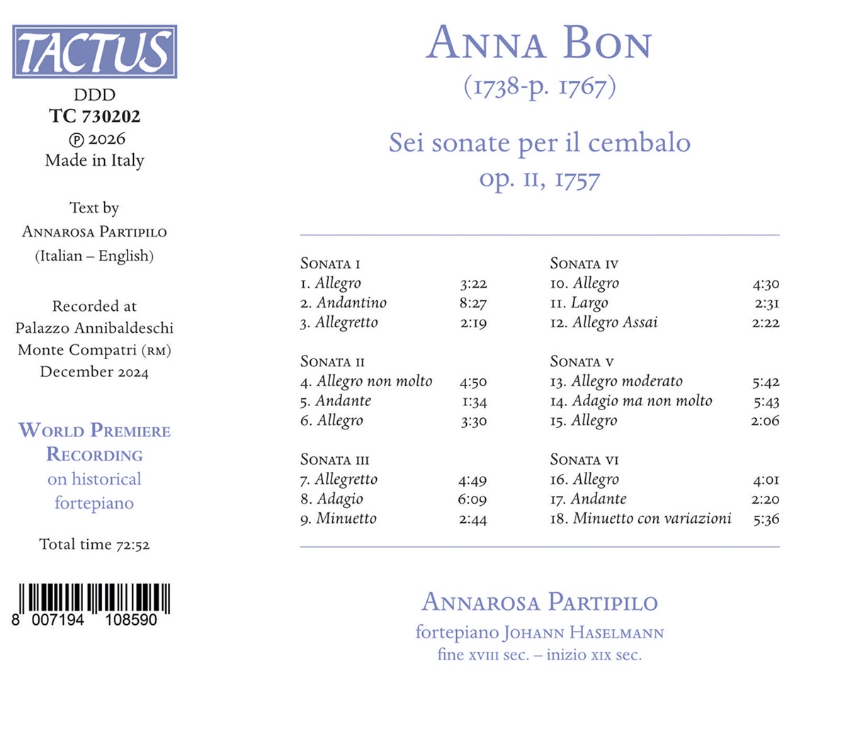 Die faszinierende und rätselhafte Anna Bon di Venezia war eine der wenigen professionellen Komponistinnen des 18. Jahrhunderts, die sich einen Platz an den europäischen Höfen sichern konnten. Als Virtuosin, Sängerin und Komponistin war sie in Venedig, Bayreuth und Nürnberg tätig, wo sie zwischen 1756 und 1759 ihre drei Werksammlungen veröffentlichte. Über sie ist nur wenig bekannt, die einzigen biografischen Details stammen aus den Widmungen und Titelblättern ihrer Veröffentlichungen. Anna studierte bei Candida della Pietà, einer Bratschenlehrerin und ehemaligen Schülerin von Antonio Vivaldi. Schon in jungen Jahren wurde sie als begabte Musikerin erkannt und profilierte sich bald auch als Komponistin. Die hier vorgestellte Sammlung „Sechs Sonaten für Cembalo“, op. 2, wurde 1757 während Annas Aufenthalt am Bayreuther Hof in Nürnberg veröffentlicht. Die Sonaten sind der Prinzessin Ernestine Auguste Sophie von Sachsen-Weimar-Eisenach, gewidmet, die Anna Bons Schülerin war, bevor sie den Herzog von Hildburghausen heiratete. Annarosa Partipilo brilliert in ihrer sorgfältigen Interpretation auf einem Hammerflügel aus dem späten 18. Jahrhundert.
