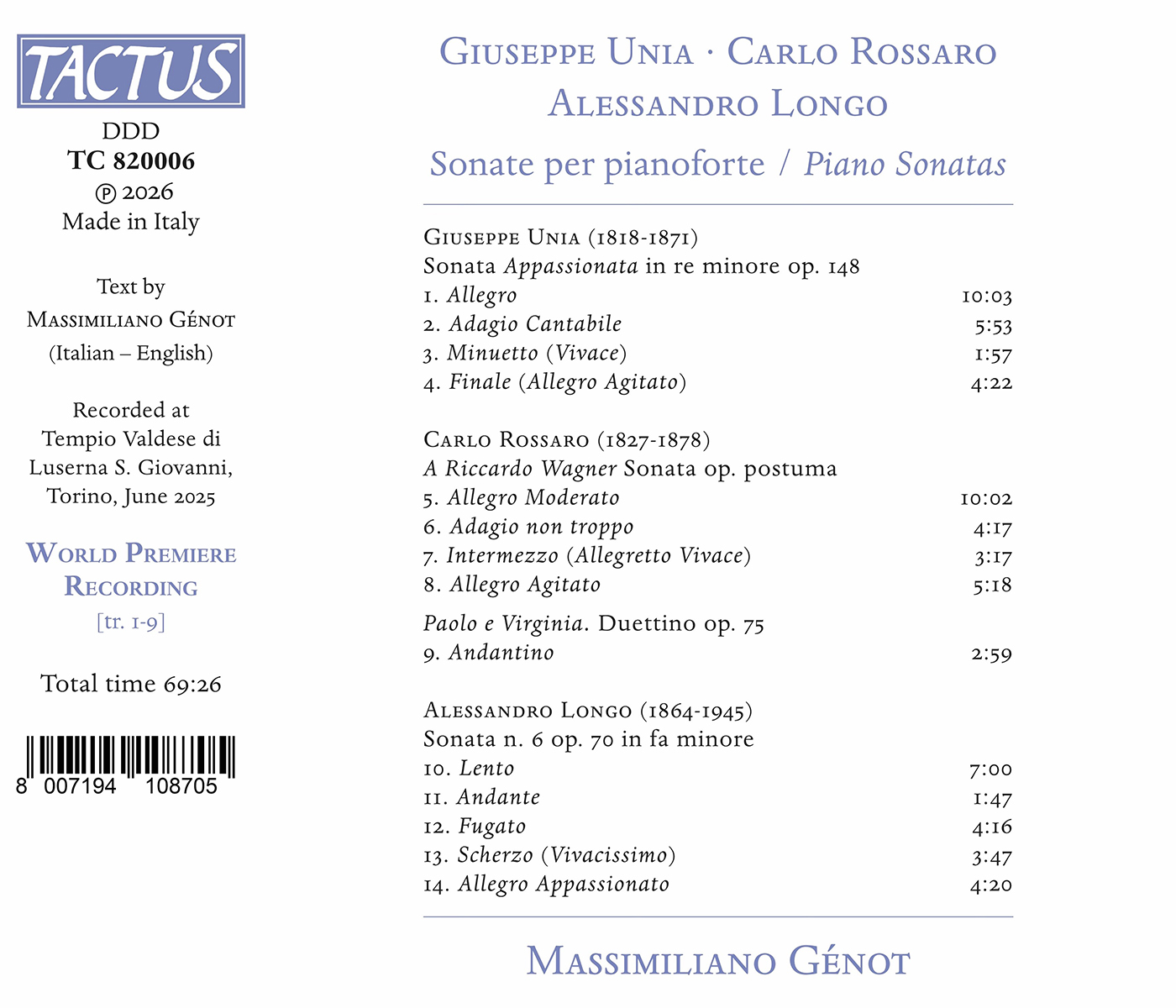 Die Einspielung, die dem preisgekrönten Pianisten Massimiliano Génot anvertraut wurde (der zuvor die Wiederentdeckung der Komponisten Federico Bufaletti und Giuseppe Unia vorantrieb), konzentriert sich auf die romantische Klaviersonate im Italien des neunzehnten Jahrhunderts. Das Thema ist besonders interessant, weil italienische Klavierkompositionen des 19. Jahrhunderts heute weitgehend unbekannt sind, was zum Teil auf die überwältigende Vorherrschaft der Opern- und Theatermusik jener Zeit zurückzuführen ist, die bereits alle anderen Musikgattungen in den Schatten stellte. Massimiliano Génots leidenschaftliche Interpretation wird diesen bedeutenden Kompositionen gerecht, die eine sorgfältige Betrachtung innerhalb der europäischen Klavierlandschaft jener Zeit verdienen. Die Kompositionen von Giuseppe Unia, Carlo Rossaro und Alessandro Longo stellen eine weitreichende Synthese aus italienischer Tradition und Einflüssen von jenseits der Alpen dar, in der sich solide Kompositionstechnik und typisch italienische Ausdruckskraft auf ebenso natürliche wie meisterhafte Weise verbinden.