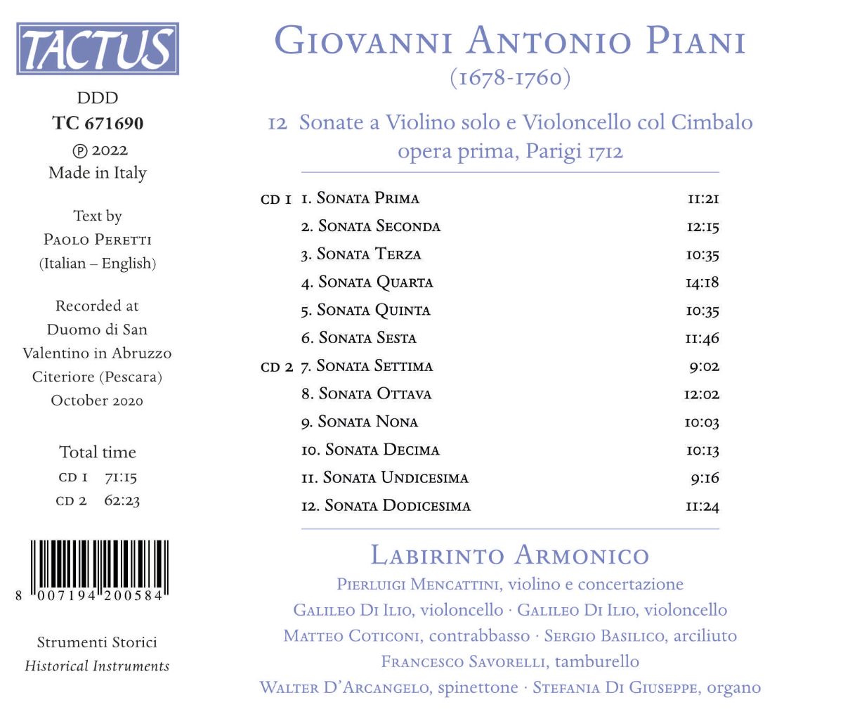 Piani: 12 Sonaten für Solovioline und Violoncello mit Cembalo