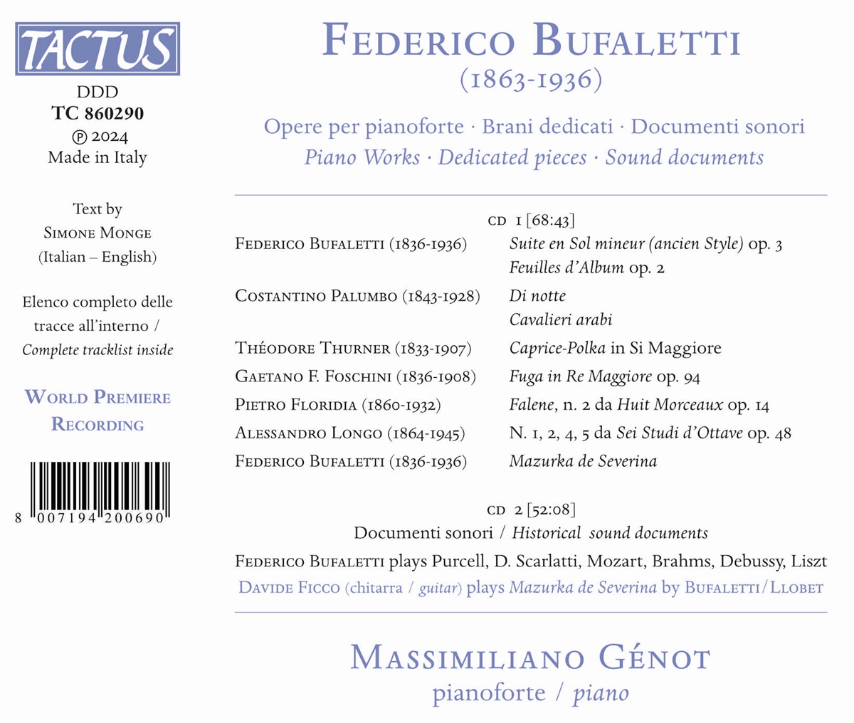 Diese äußerst interessante monografische Aufnahme ist Federico Bufaletti gewidmet, einem vergessenen Künstler und Hauptvertreter der neapolitanischen Klavierschule, die Ende des 19. Jahrhunderts nach Turin zog. Das Album basiert auf einer eingehenden Untersuchung der Doppelrolle des Komponisten und Pianisten Bufaletti: Neben der Präsentation seines gesamten Klavierwerks wurden seltene Aufnahmen aus dem frühen zwanzigsten Jahrhundert wiedergefunden, auf denen der Künstler Stücke von Domenico Scarlatti, Claude Debussy, Wolfgang Amadeus Mozart, Franz Liszt und anderen interpretiert. Das Album enthält auch Bufaletti gewidmete Werke von Vertretern der italienischen Klavierschule wie Alessandro Longo, Costantino Palumbo, Gaetano Foschini und Pietro Floridia. Der Interpret von Bufalettis Musik ist der Pianist Massimiliano Génot, der bereits dafür geschätzt wurde, die Klavierwerke von Giuseppe Unia ans Licht gebracht zu haben.