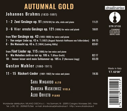 Eine Auswahl von Liedern, wie breit sie auch sein mag, konzentriert sich zwangsläufig auf die deutsche Sprache, wie es die theoretische, historische und technische Definition des Wortes ‚Lied‘ und des Genres ‚Lieder‘ vorschreibt. Die besondere Auswahl an Liedern dieses Albums vereint etwas poetisches und sie reichen inhaltlich vom Eros bis zur Nostalgie. Die Lieder von Johannes Brahms und Gustav Mahler entführen den Zuhör in eine Sphäre, die fast unabhängig von Zeit und Raum ist. Gleichzeitig ist die Atmosphäre und die Bewegung der passeggiata zu spüren, eines leichten, ungezwungenen Spaziergangs. Dieses Bild, das die Idee der ‚Bewegung’ in Raum und Zeit impliziert (der kurze Raum eines öffentlichen Gartens, der kurze Raum eines Frühlingsnachmittags oder der zwischen Sommer und Herbst), bekommt eine viel umfassendere Bedeutung, sobald wir eine logische Verbindung zwischen der demokratischen sozialen und kulturellen Funktion der ‚Proms’ und der reifen Selbstanalyse der Art von erhabener, tiefgründigen Musik, die eng mit einem poetischen Text von ähnlichem spirituellem Niveau verbunden ist und die zwischen 1860 und 1914, zwischen den nationalen (oder sogar ‚nationalistischen”) Untertönen der genannten Kultur und dem Ersten Weltkrieg, ein so charakteristisches Merkmal der österreichisch-deutschen Kultur war. Die Altistin Sara Mingardo wird von der Bratschistin Danusha Waskiewicz und dem Pianisten Aldo Orvieto begleitet.