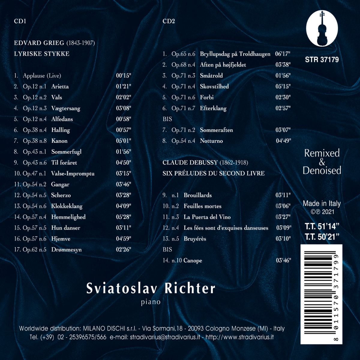 Bis ins hohe Alter spielte Swjatoslaw Richter auf einem schwindelerregend hohen Niveau, das die meisten Pianisten nicht einmal zu ihrer Blütezeit erreichen. Das vorliegende Doppelalbum fasst Live-Aufnahmen vom Januar und Oktober 1993 aus Athen, Kozani und Cosenza zusammen, bei denen der damals 78-jährige Virtuose Auszüge aus Griegs „Lyrischen Stücken“ und aus Debussys zweitem Buch der „Préludes“ spielt. Die lange Zeit vergriffene Stradivarius-Produktion wurde für diese Wiederveröffentlichung noch einmal entrauscht und sorgfältig remastert.