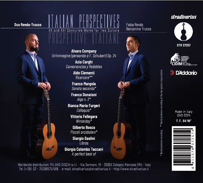 Das Repertoire des Albums „Italian Perspectives“ umfasst Musik für zwei Gitarren, die von italienischen Komponisten in den letzten 50 Jahren geschrieben wurde, darunter auch bekanntere Figuren wie Franco Donadoni, Giorgio Gaslini, Aldo Clementi und Bianca Maria Fugeri. Die Besonderheit dieses Programms liegt in seiner eklektischen Vielfalt, die von eher traditionellen Einflüssen, die in der Vergangenheit verwurzelt sind, bis hin zu eindeutig zeitgenössischen Ausdrucksformen reicht. Das Album erkundet, auf welch unterschiedliche Weise das Gitarrenduo von verschiedenen Komponisten interpretiert wurde.